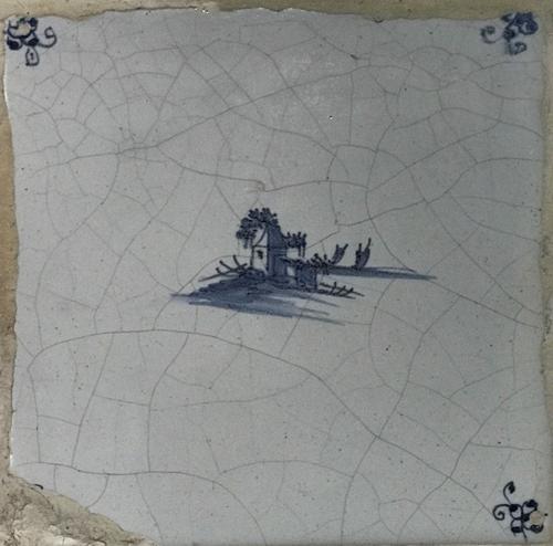 Tegel van aardewerk met tinglazuur voorstellende lan...