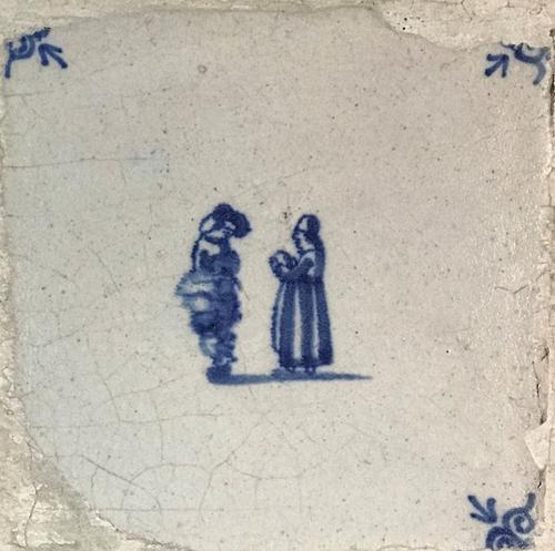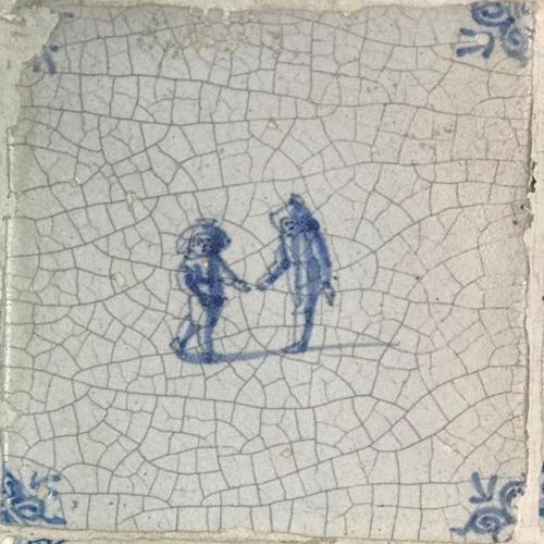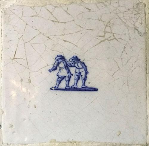 Tegel van aardewerk met tinglazuur voorstellende klo...