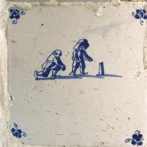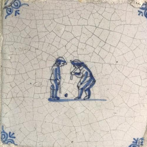 Tegel van aardewerk met tinglazuur voorstellende boksen