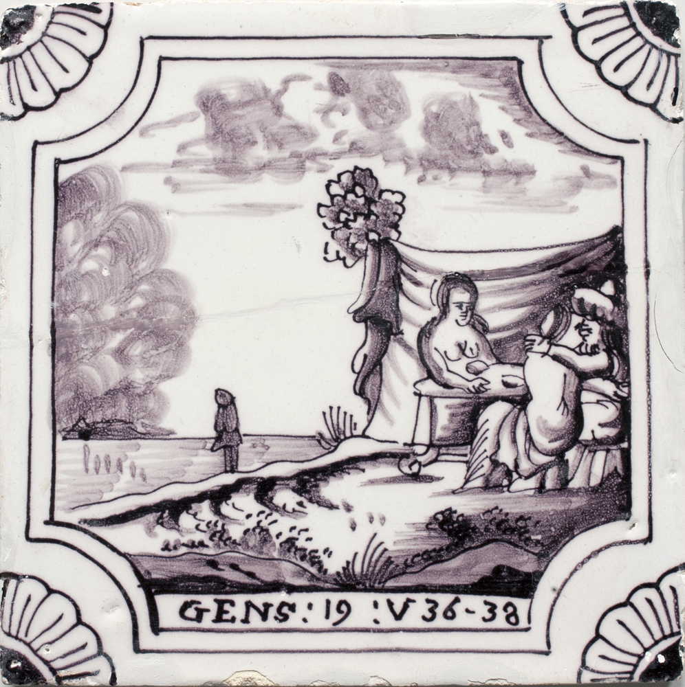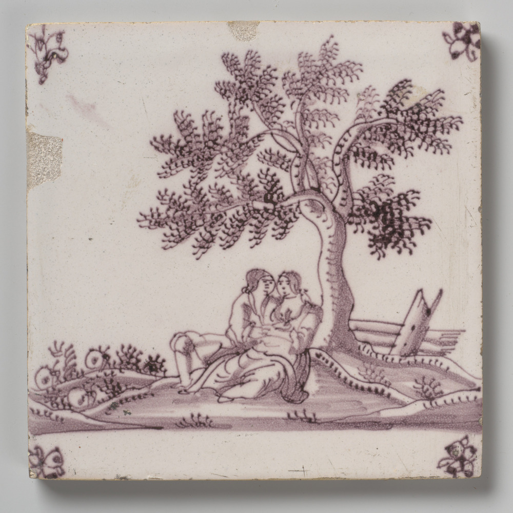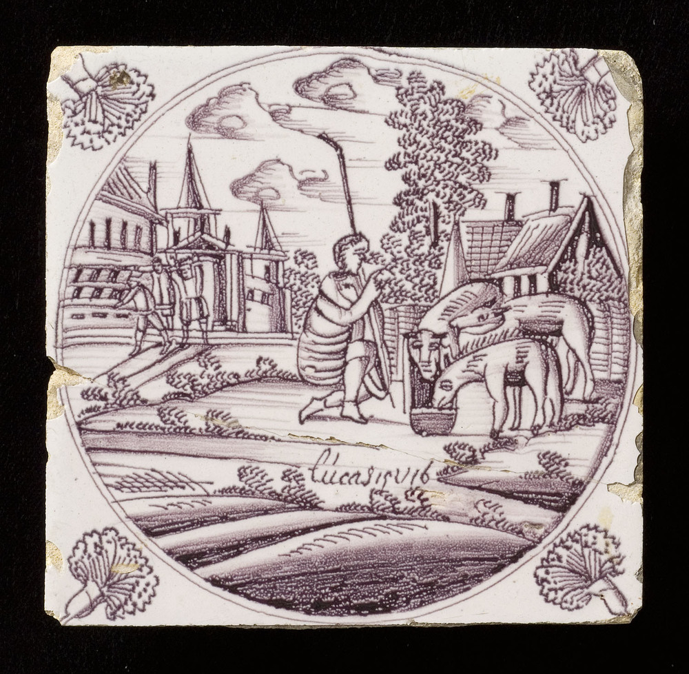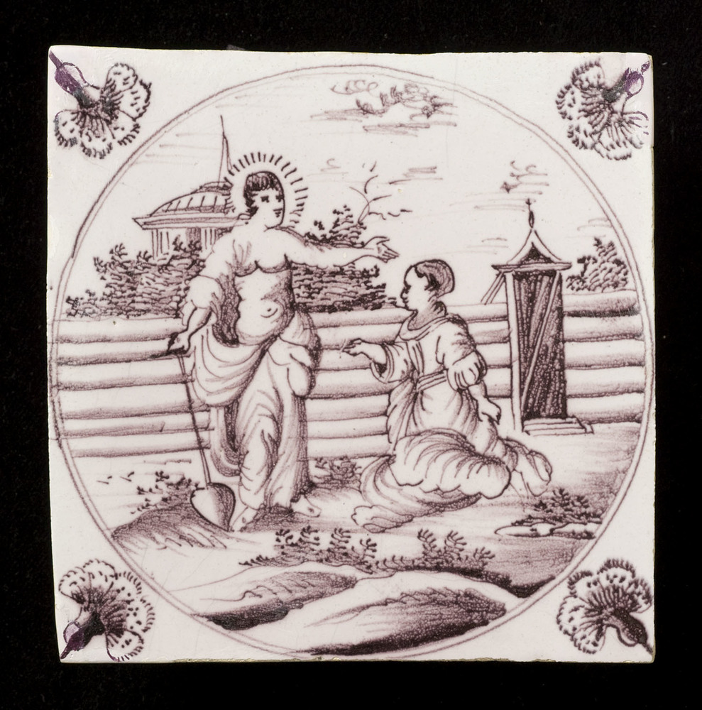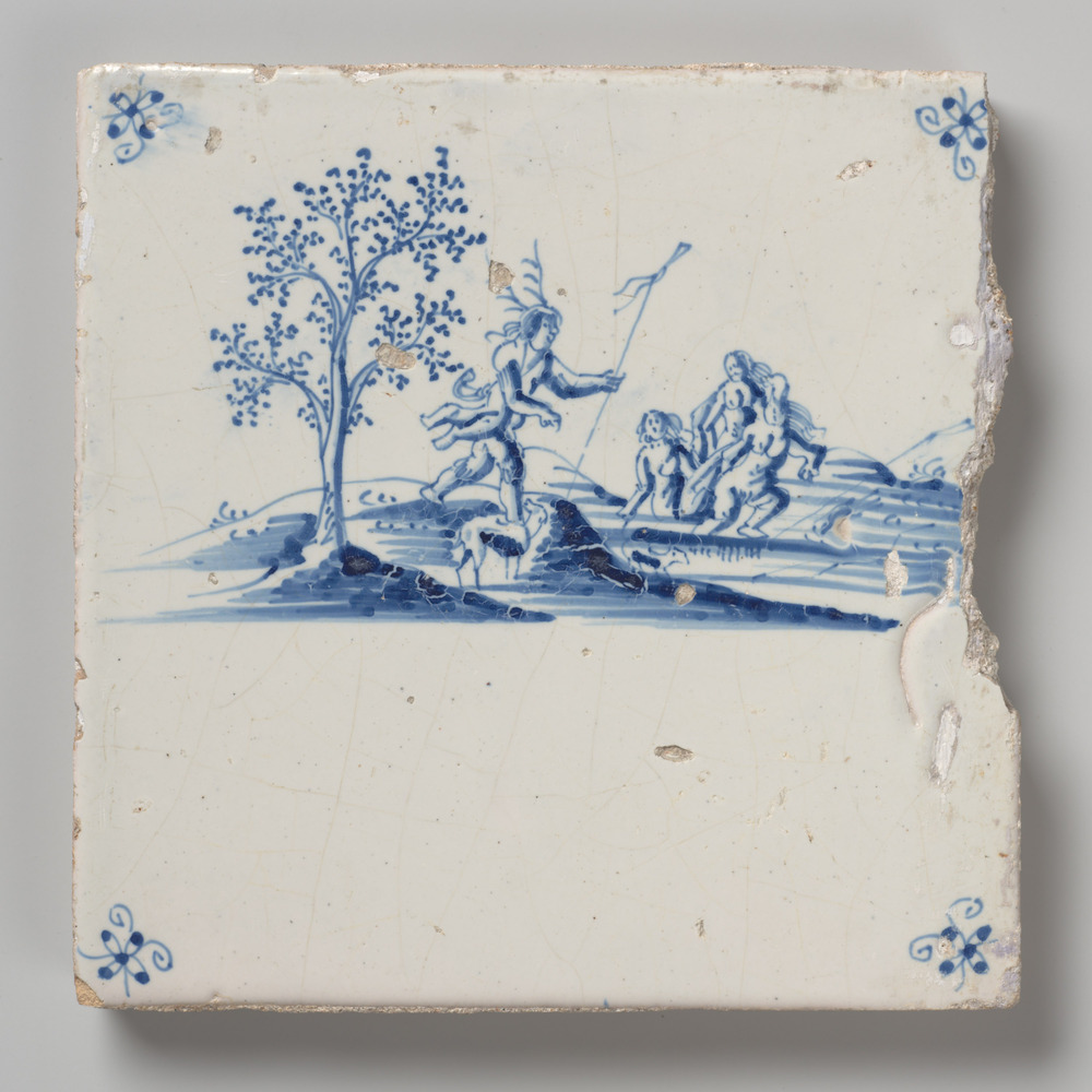 Tegel van keramiek met tinglazuur, voorstellende: De...