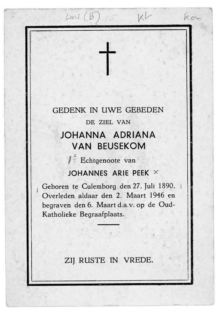 bidprent voor Johanna Adriana van Beusekom. Geboren ...