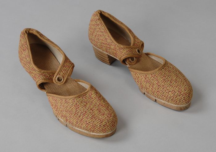 Damesschoenen van rood, geel en beige geweven papier...