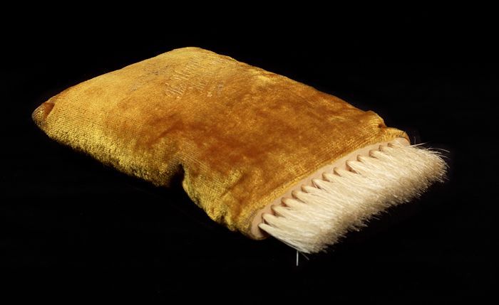 Hoedenborstel, smal houten deel met witte borstelhar...