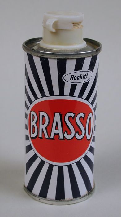 Klein cilindrisch blik Brasso met decoratie in wit, ...