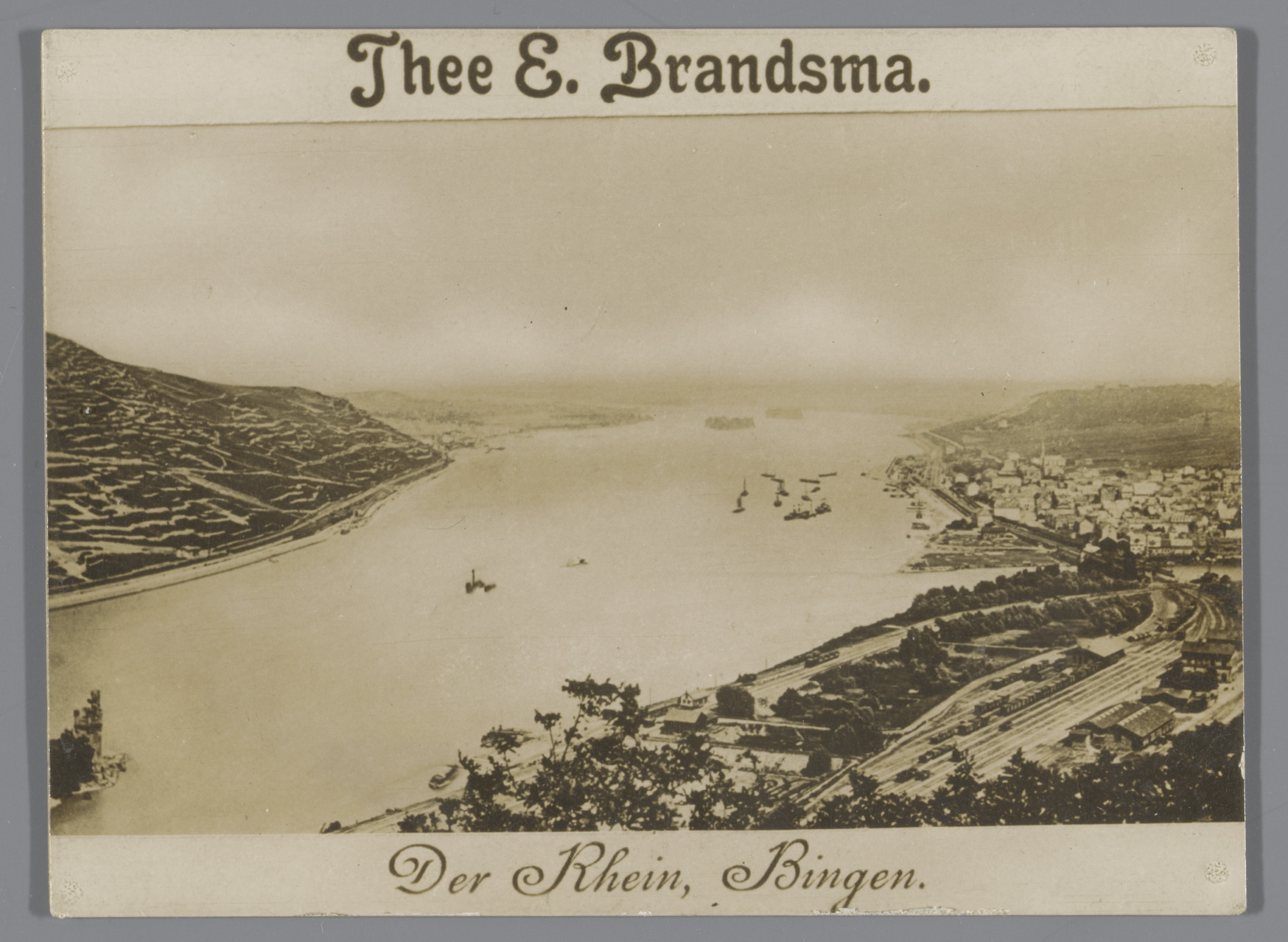 Gezicht op de Rijn bij Bingen, reclame voor Thee E. ...