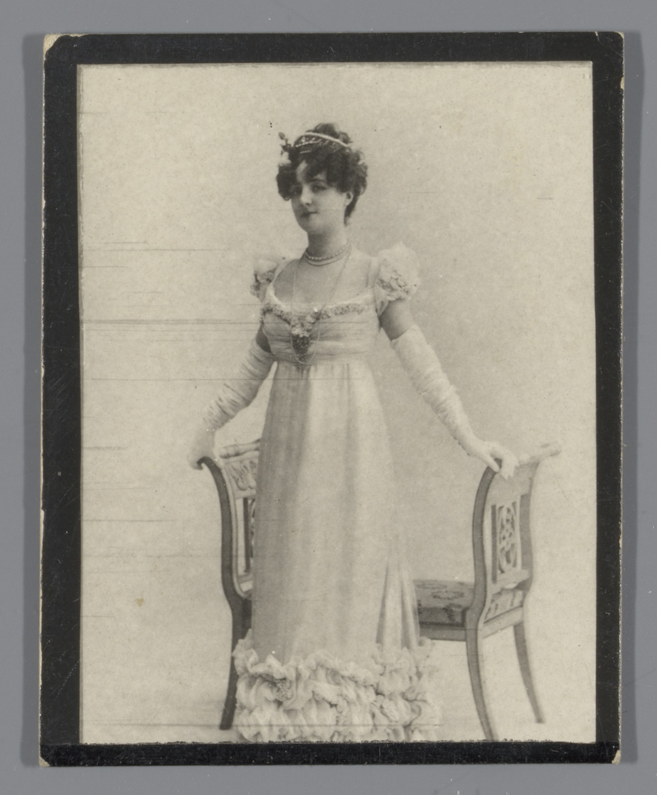 Portret van Cléo de Mérode in wandelkostuum, reclame...