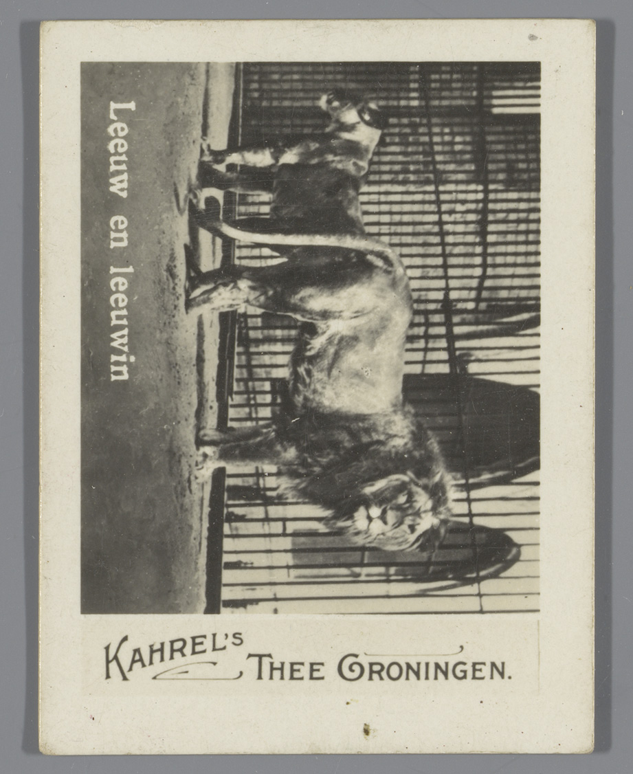 Leeuw en leeuwin in een kooi, reclame voor Kahrel's ...