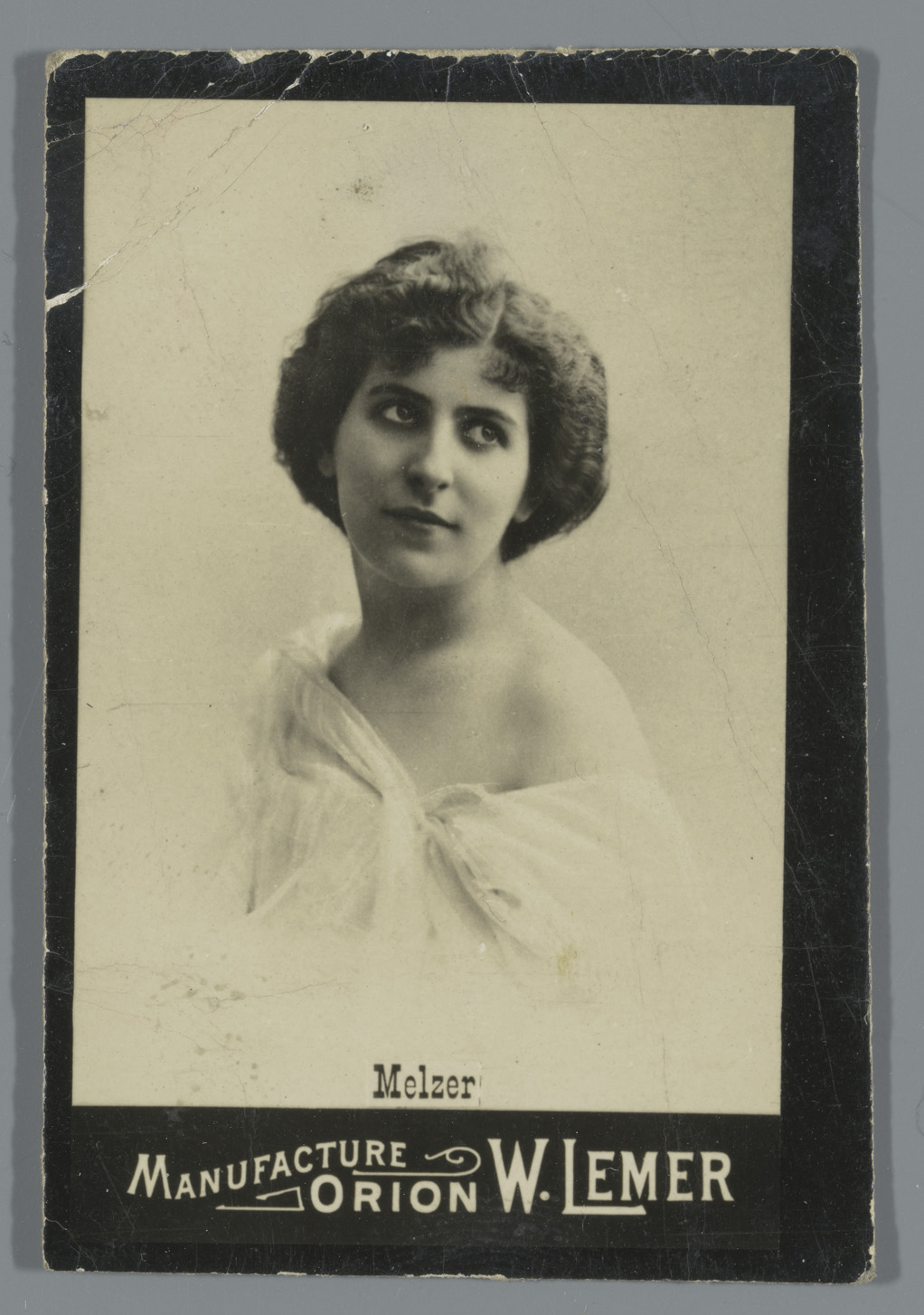 Portret van een vrouw aangeduid als Melzer, reclame ...