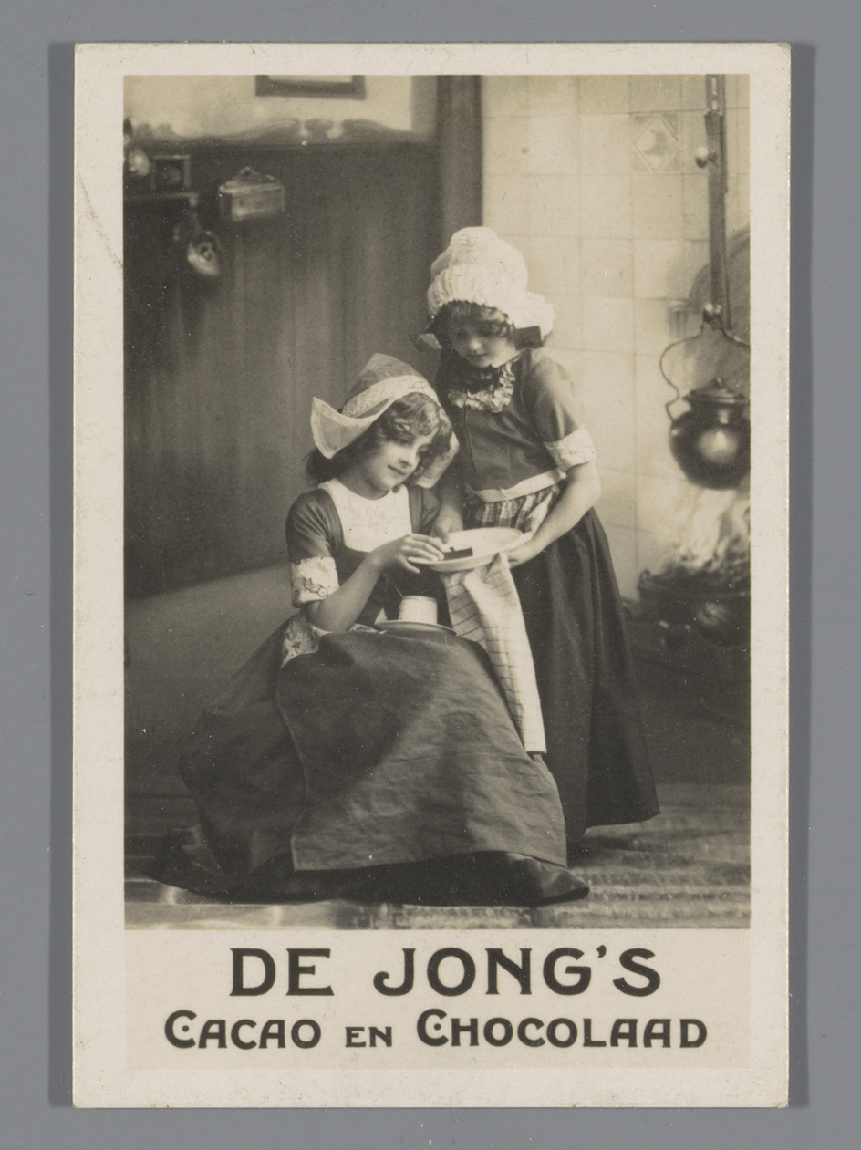 Twee meisjes in klederdracht, reclame voor de Jong's...