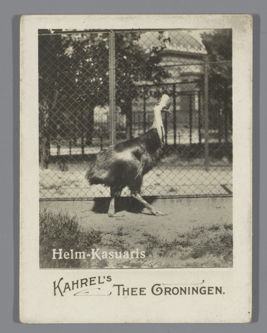 Helmkasuaris in een kooi, reclame voor Kahrel's Thee...