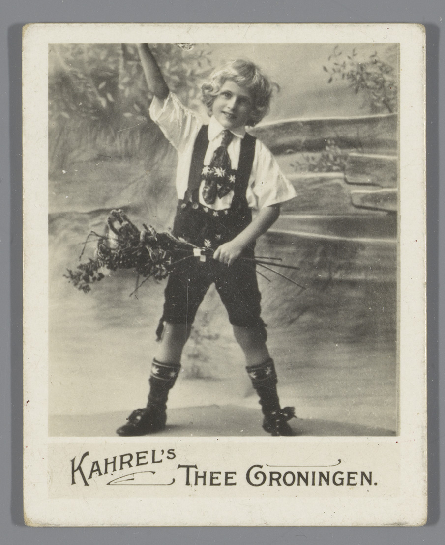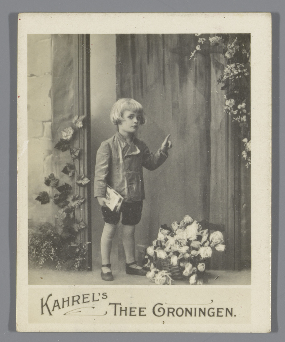 Jongen met boeket in zijn handen, reclame voor Kahre...