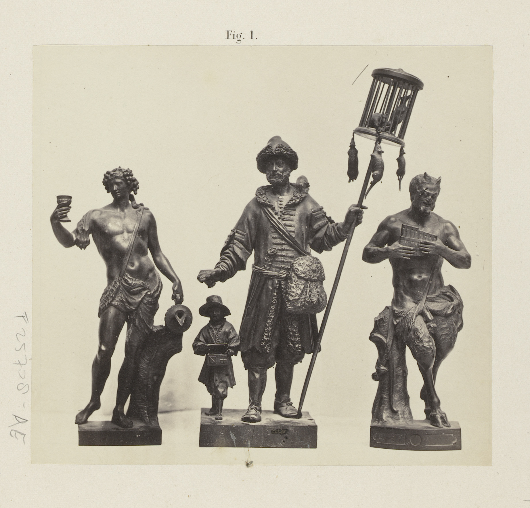 Drie houten beelden: rattengifverkoper, Pan en Ganym...