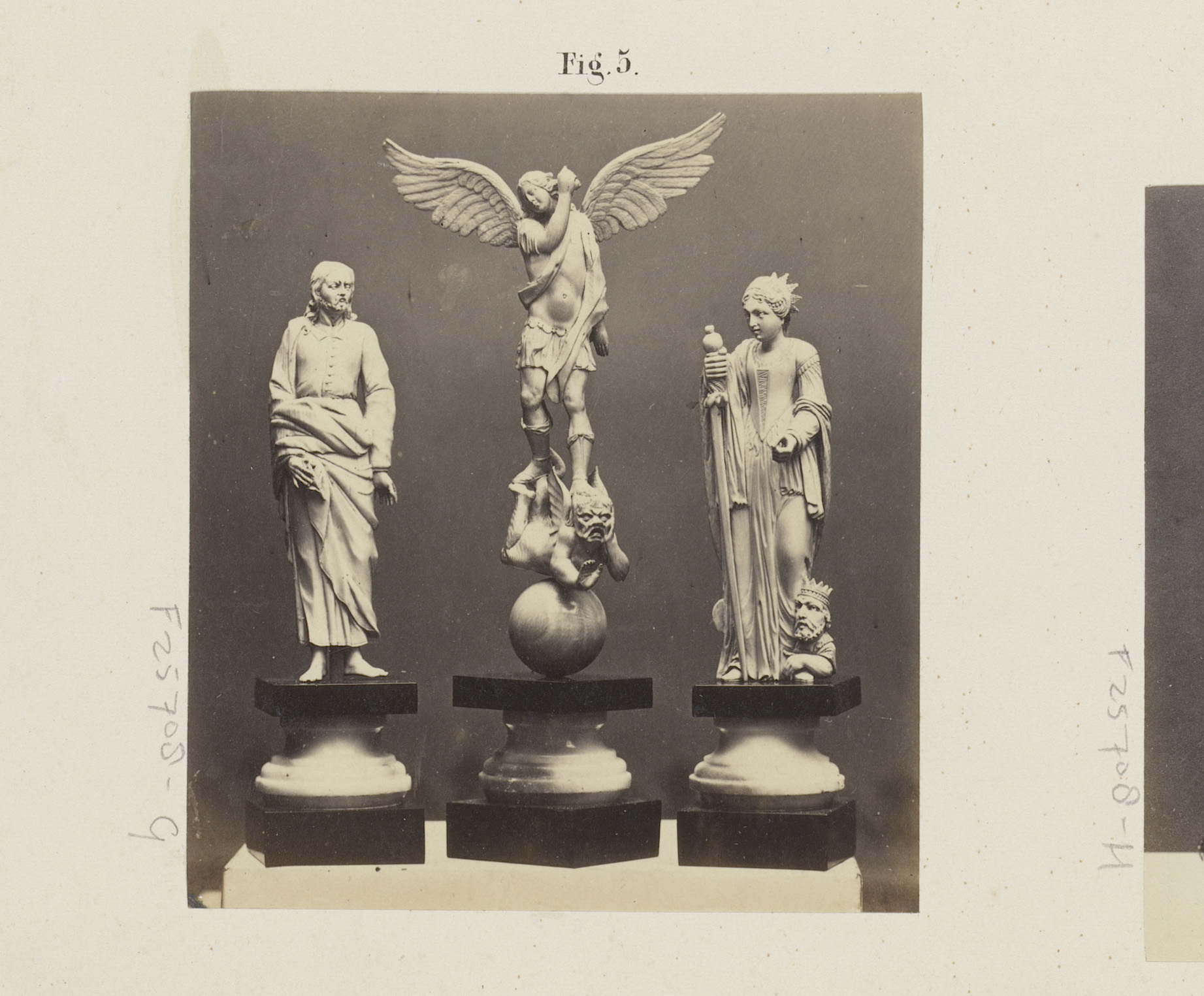 Drie ivoren beelden op marmeren voetstukken op de Te...