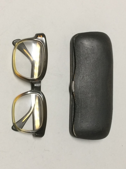 Bril met goudkleurig montuur in metalen brillenkoker...