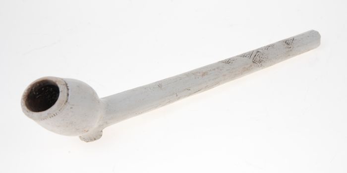 Kleipijp met versierde steel, dubbel conisch model, ...