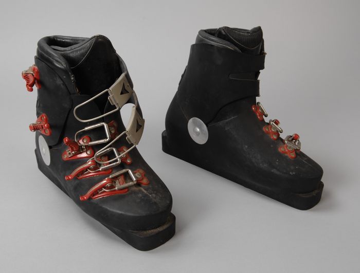 Paar skischoenen van zwart kunststof met rode sluiti...