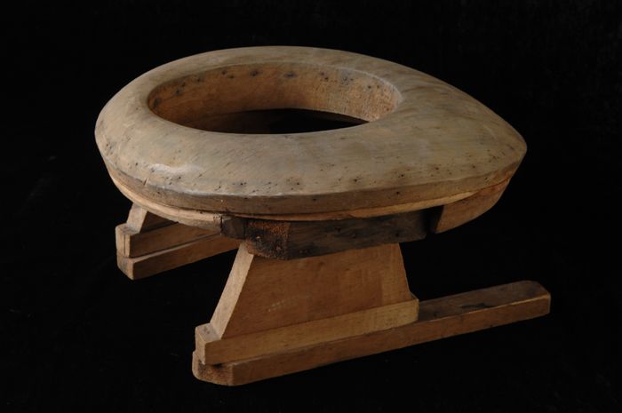 Hoedenmal van hout, onderzijde drie gaten, "281" en ...