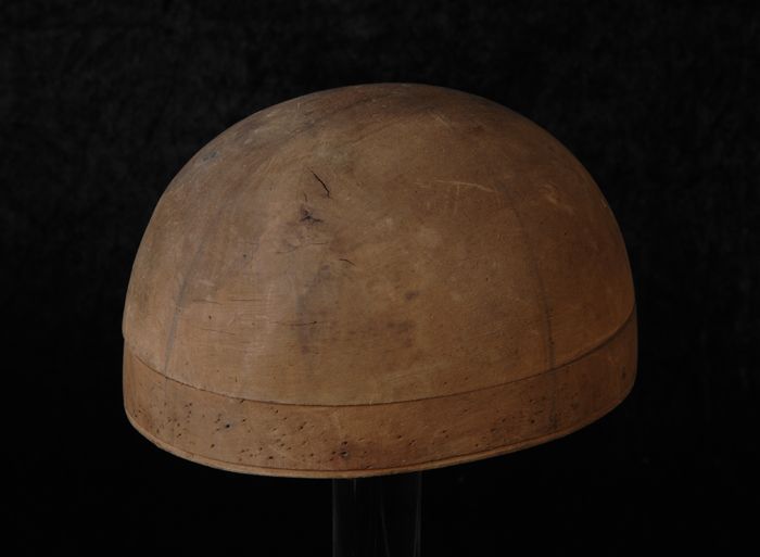 Houten hoedenvorm, op twee voeten geschroefd, ijzere...