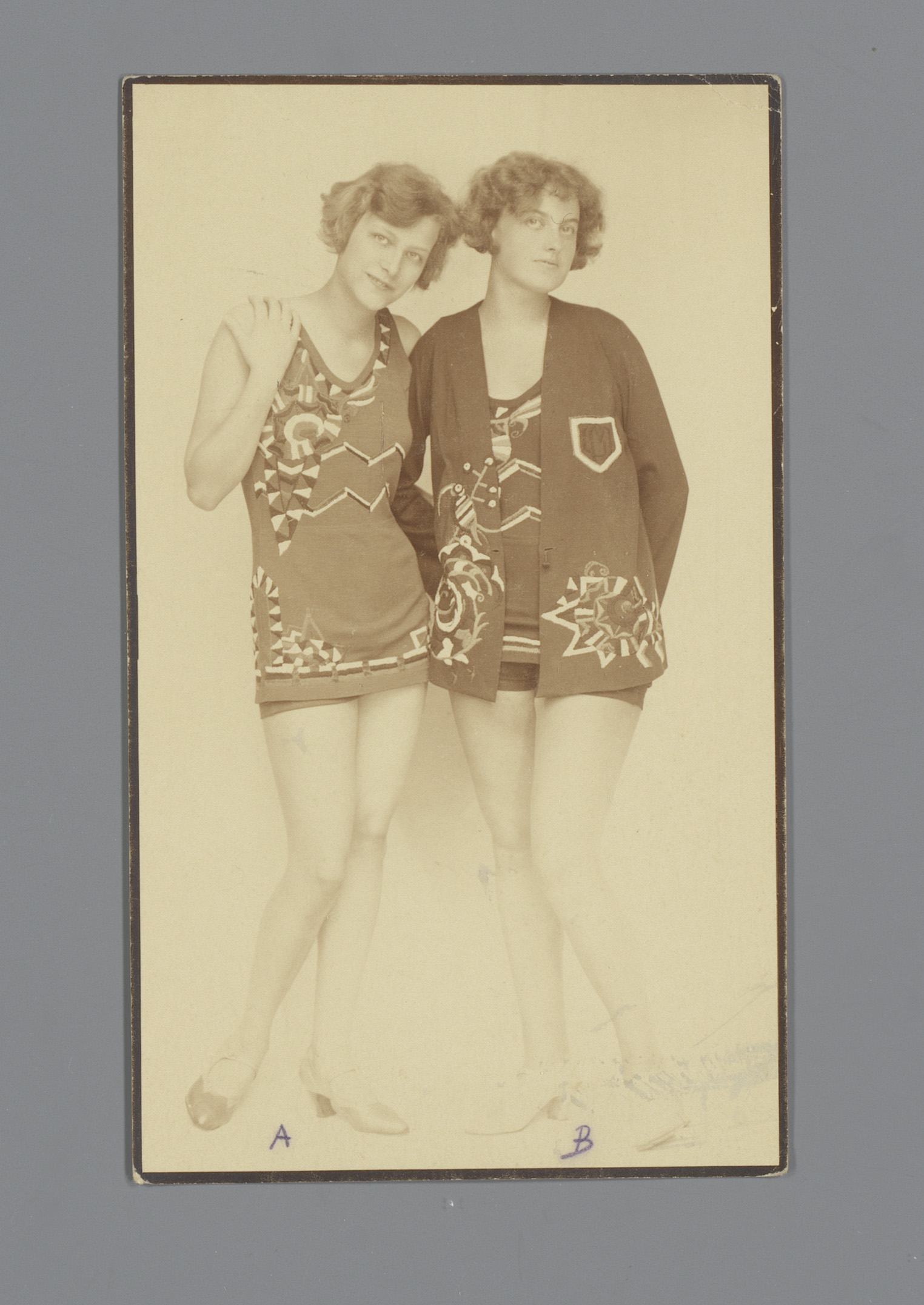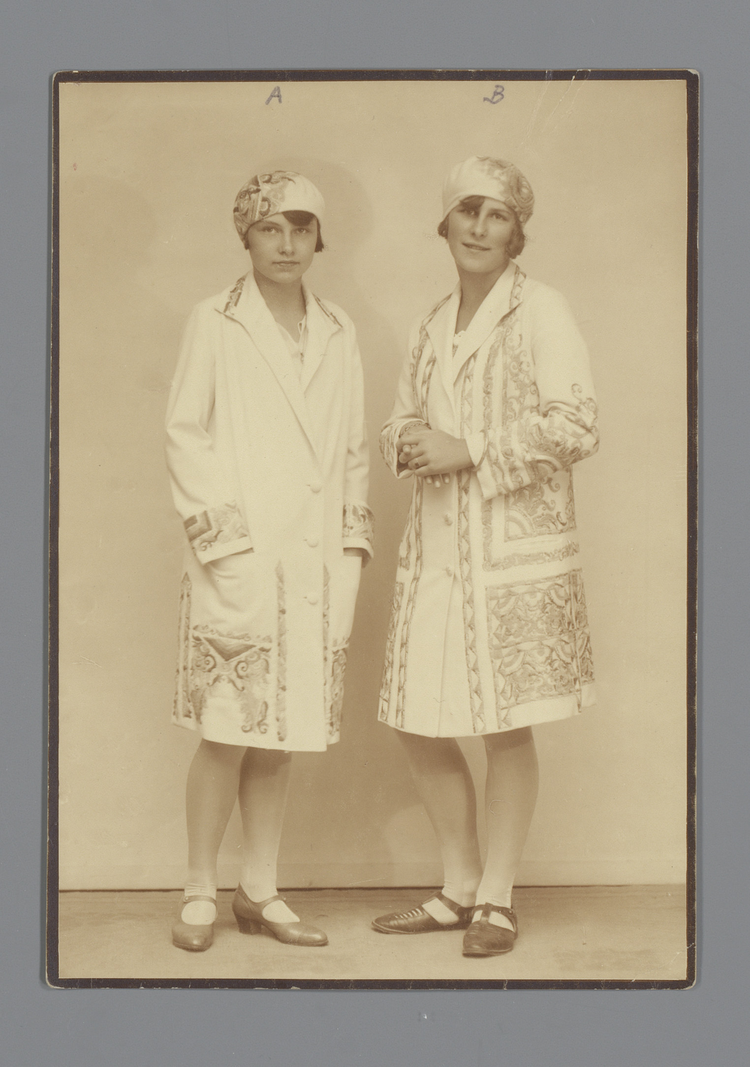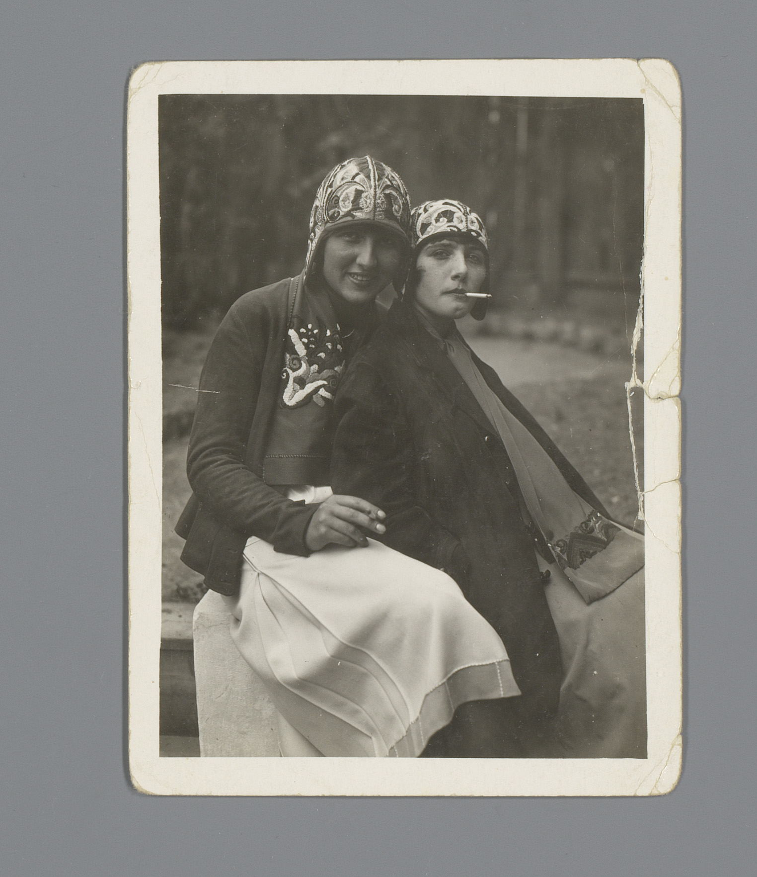 Twee modellen met sigaret en geborduurde kleding en ...