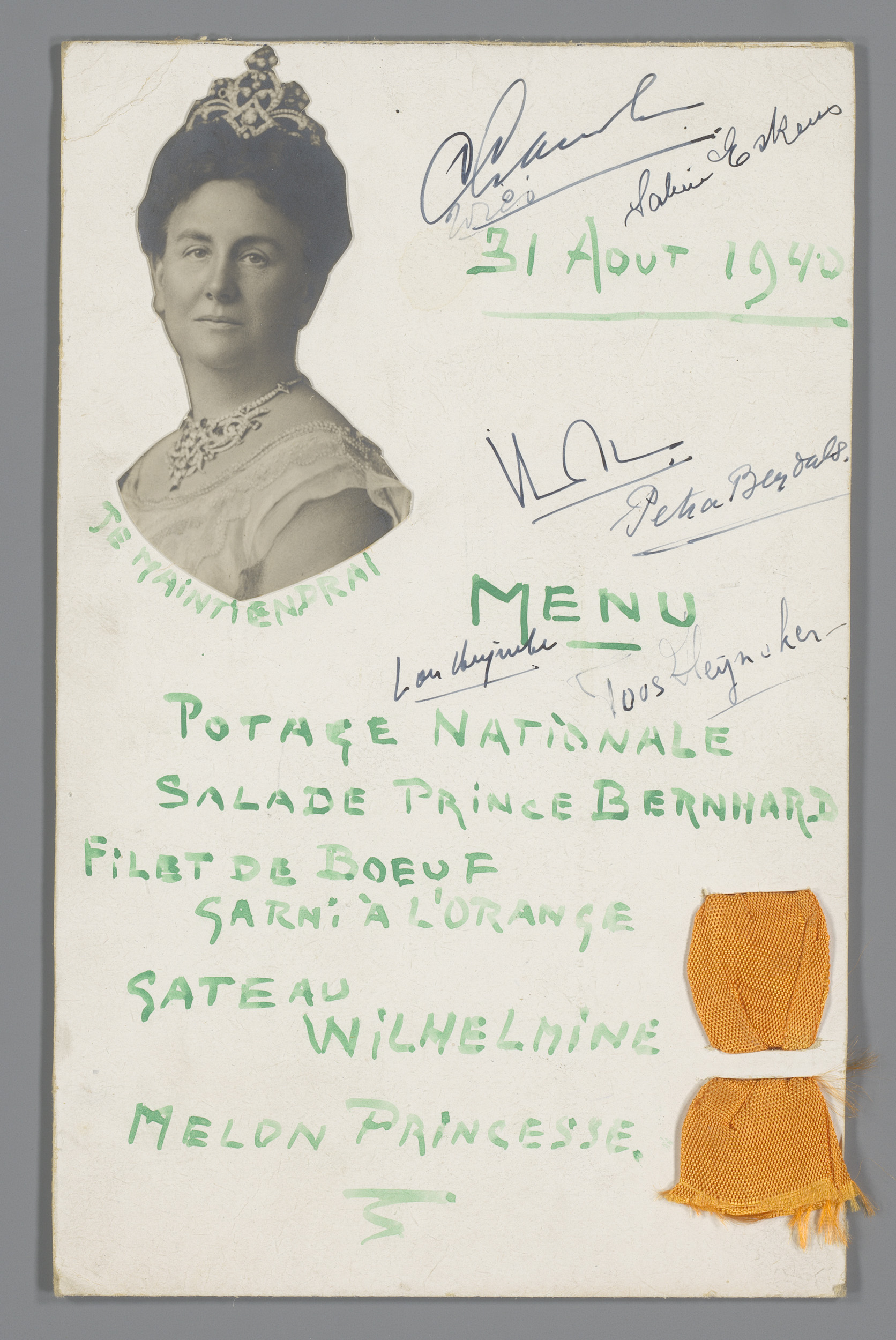 Portret van koningin Wilhelmina op een menukaart met...