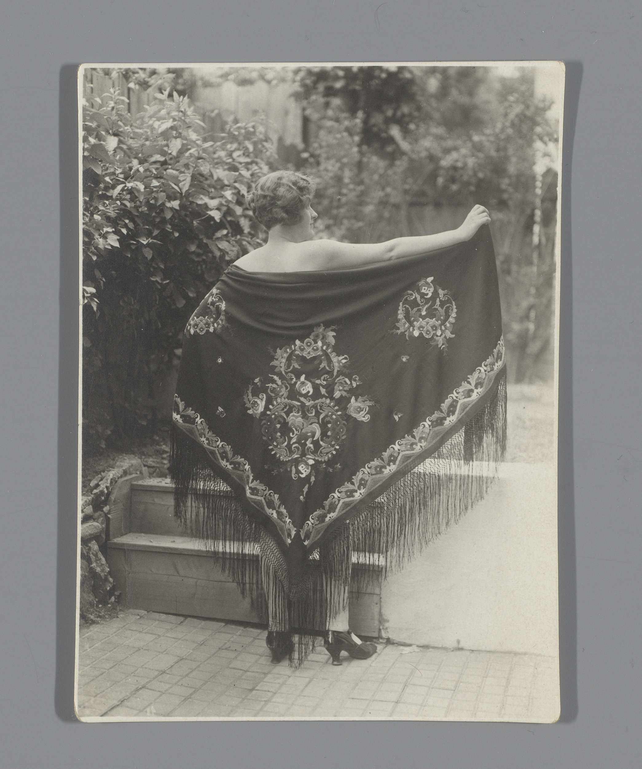 Model met geborduurde omslagdoek, model nr. 13, van ...