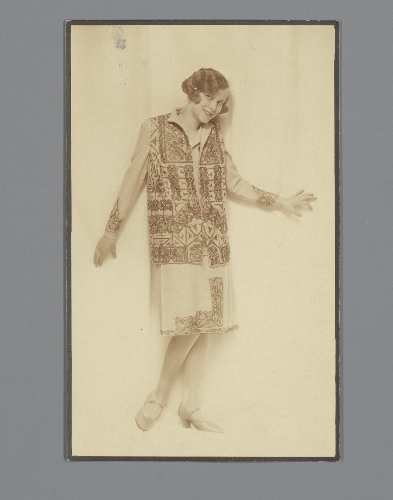 Model in geborduurde jas van de Wiener Werkstätte