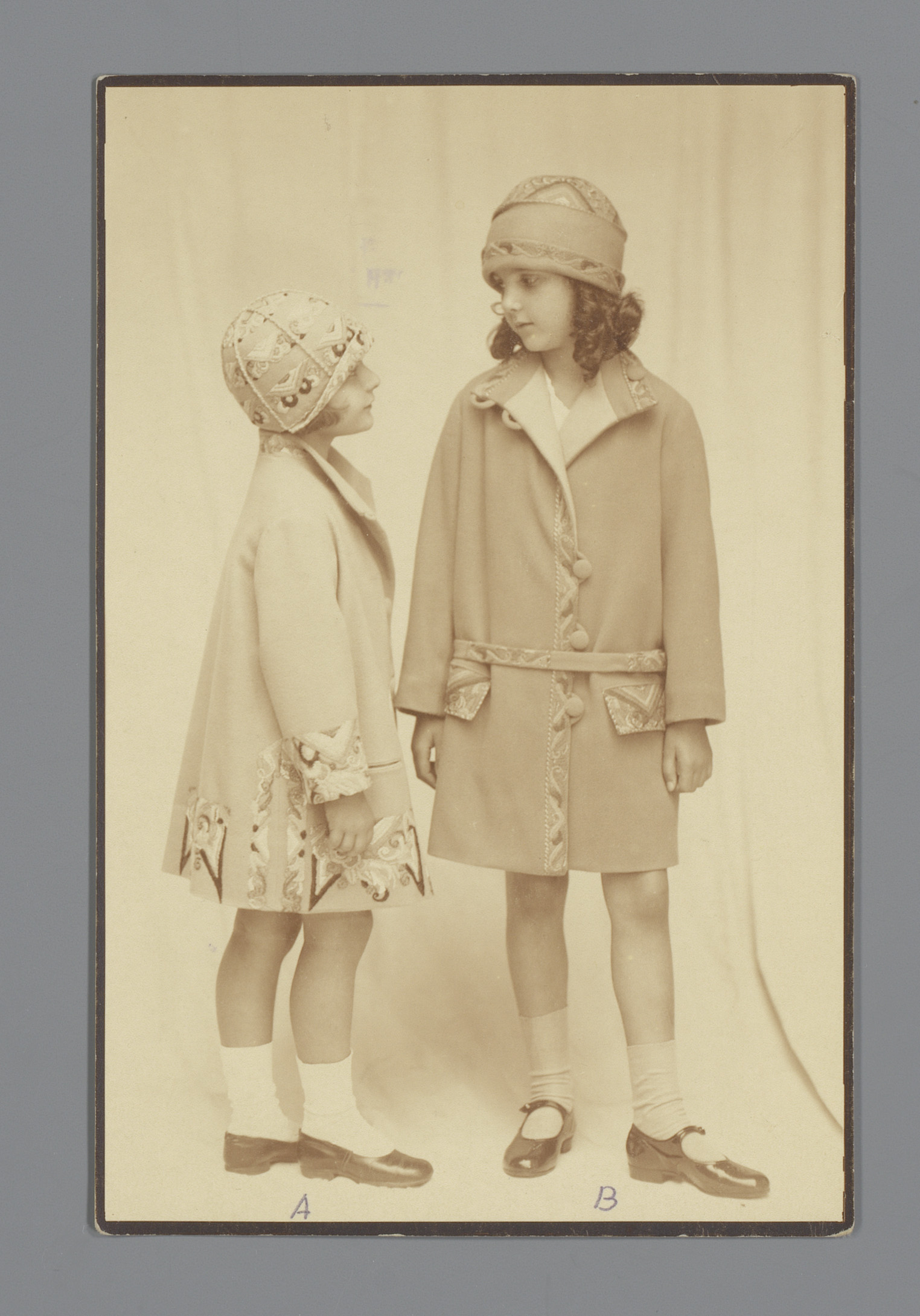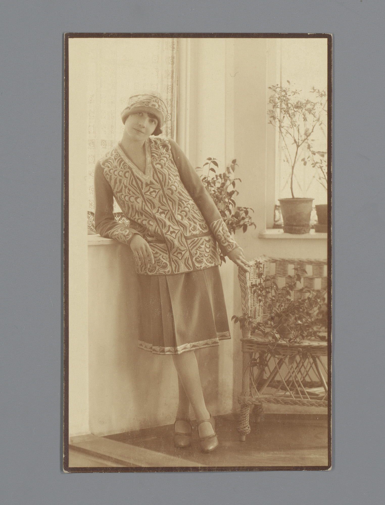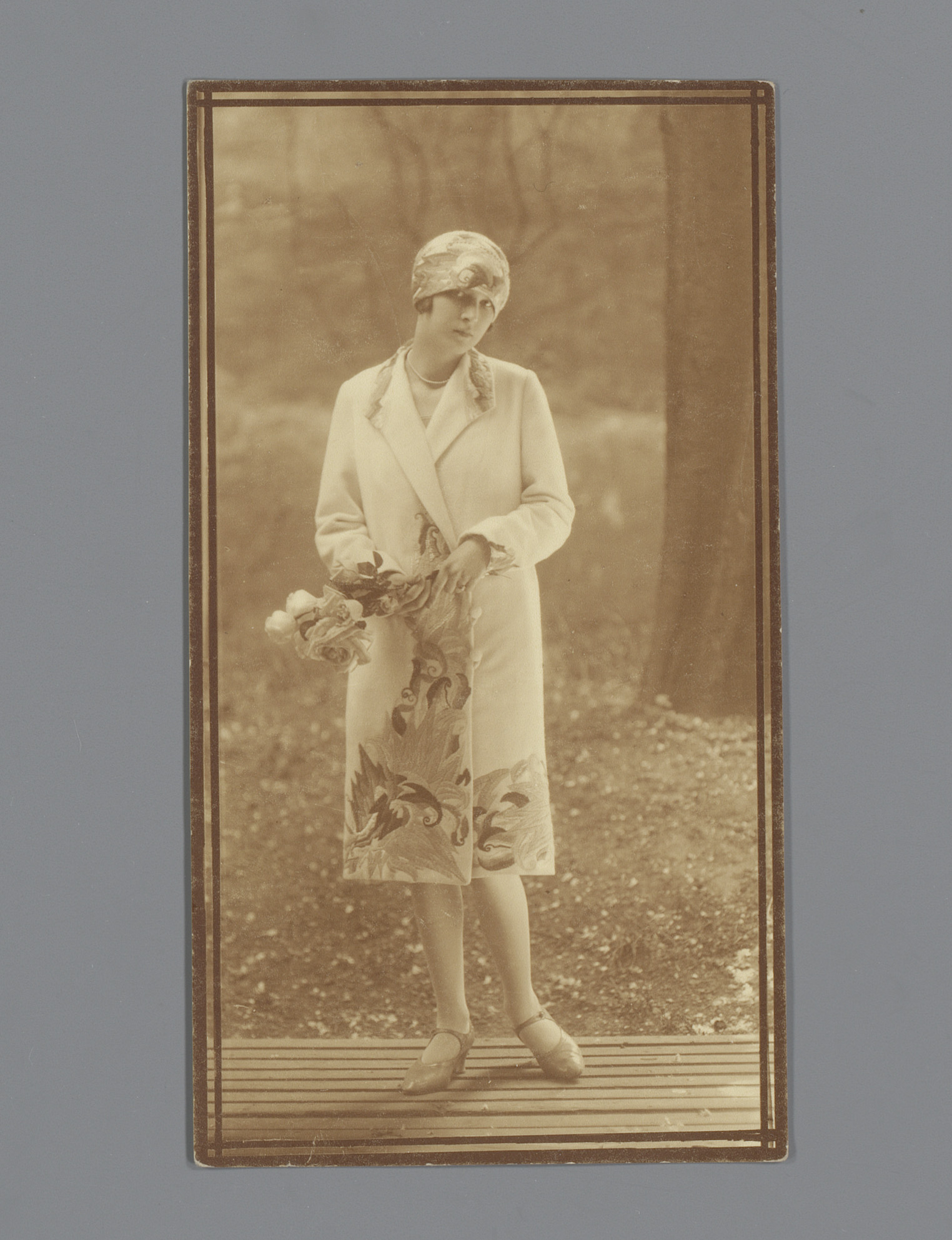Model met geborduurde jas en muts van de Wiener Werk...