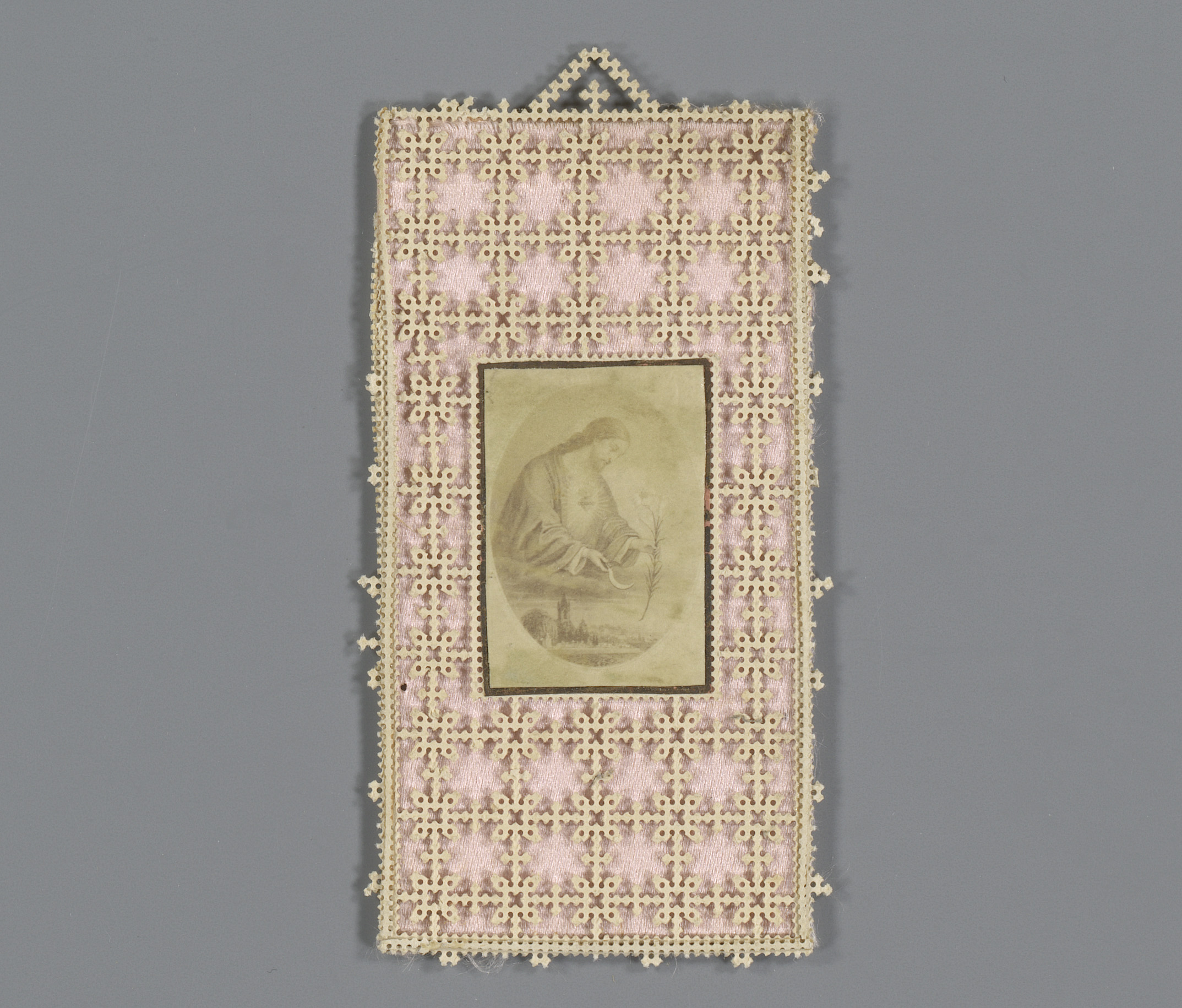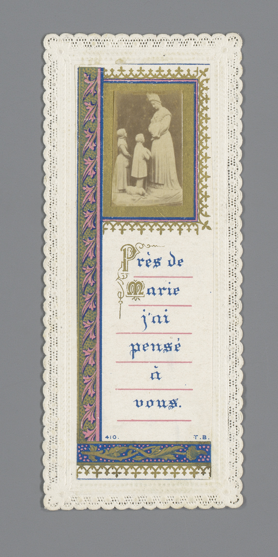 Fotoreproductie van een schilderij van Maria op bidp...