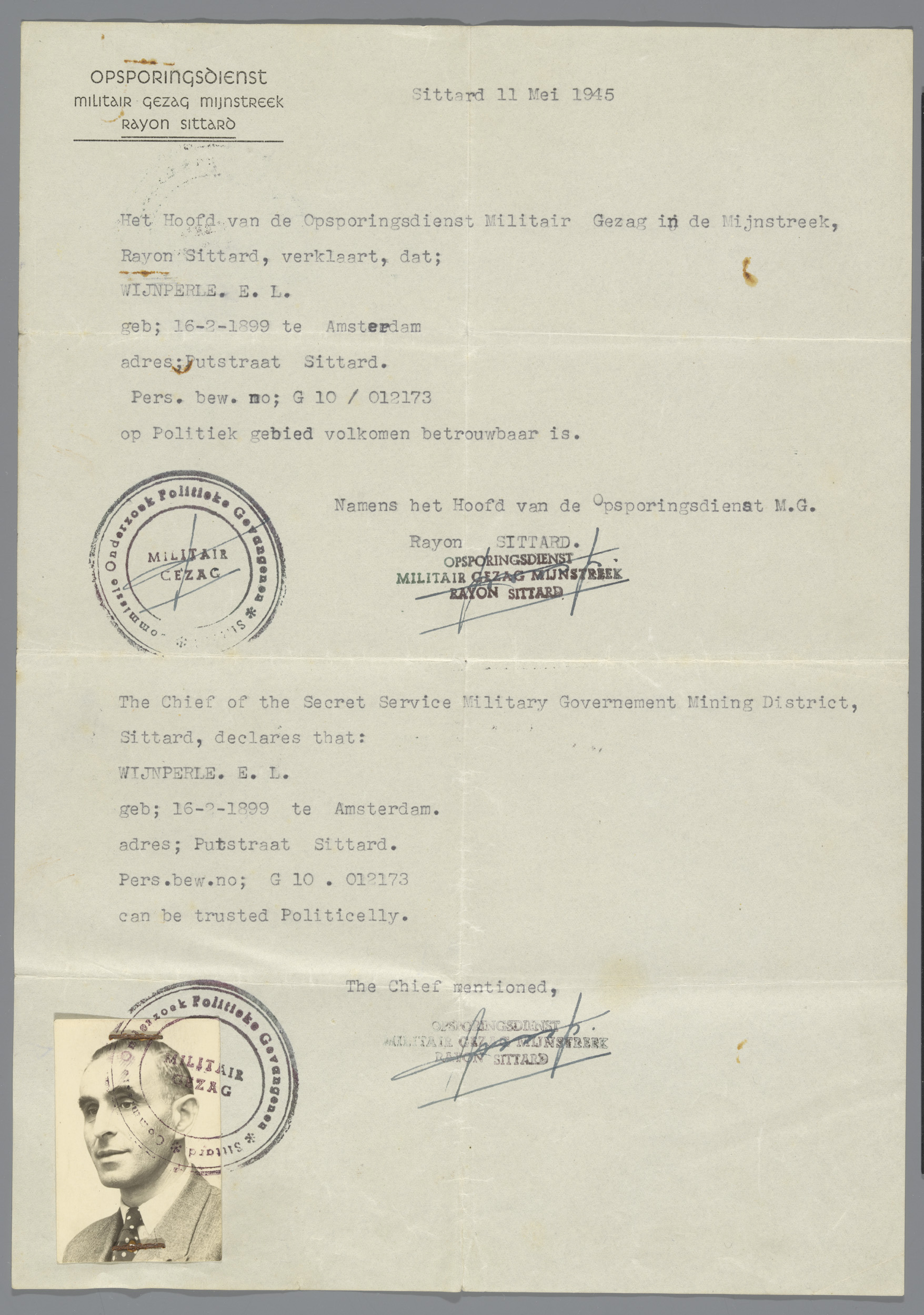 Portret van Emanuël Louis Wijnperle, op document van...