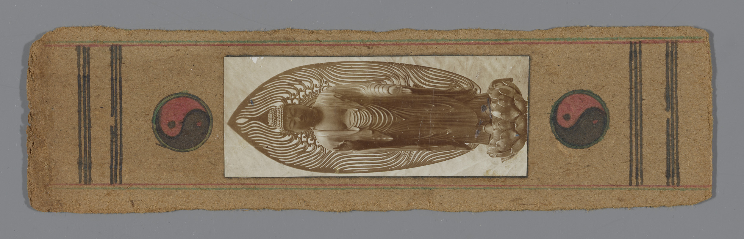 Boeddhabeeld op lotus, op bladwijzer met yin-yangsym...