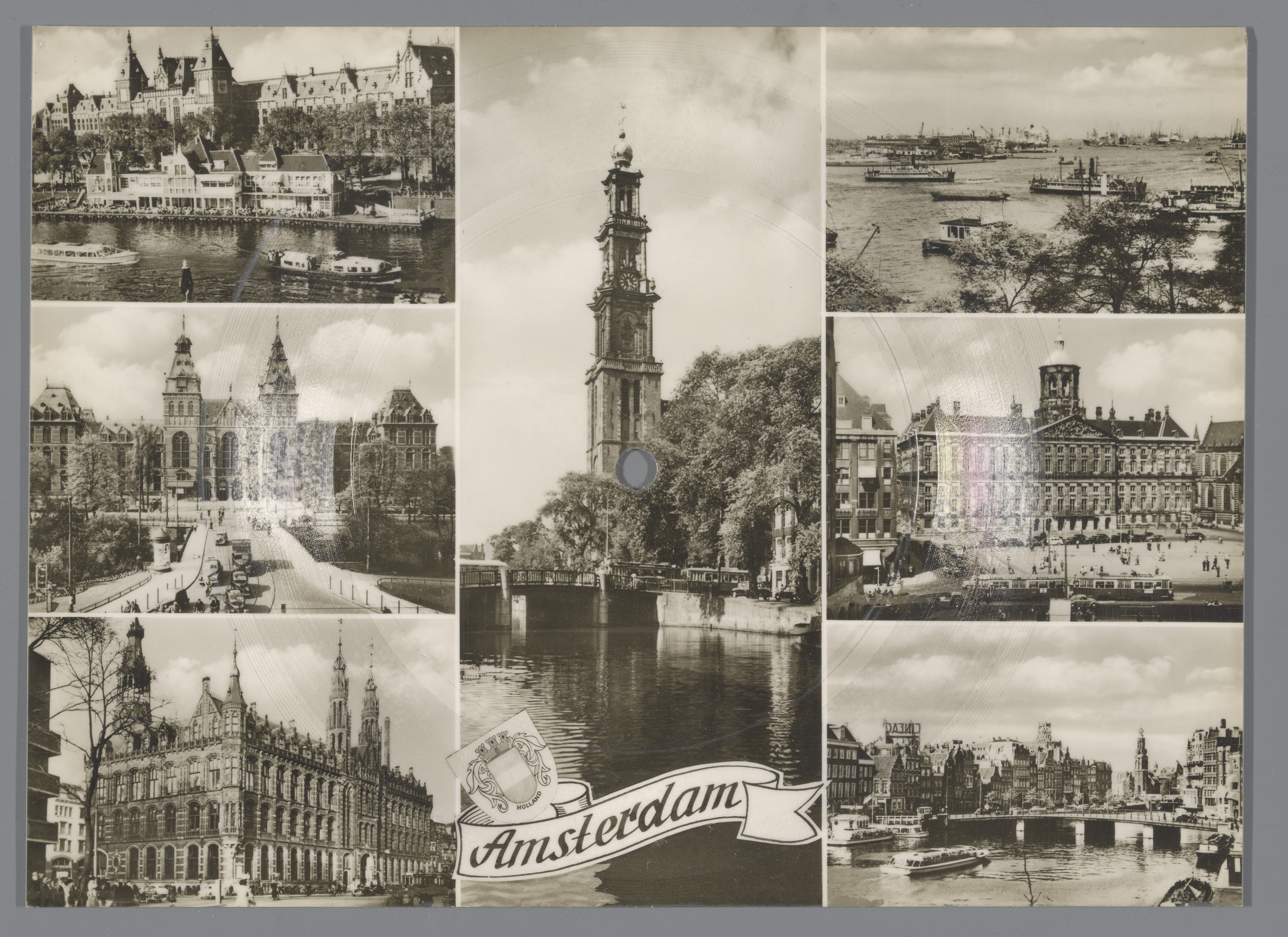 Fonokaart: prentbriefkaart met zeven foto's van Amst...