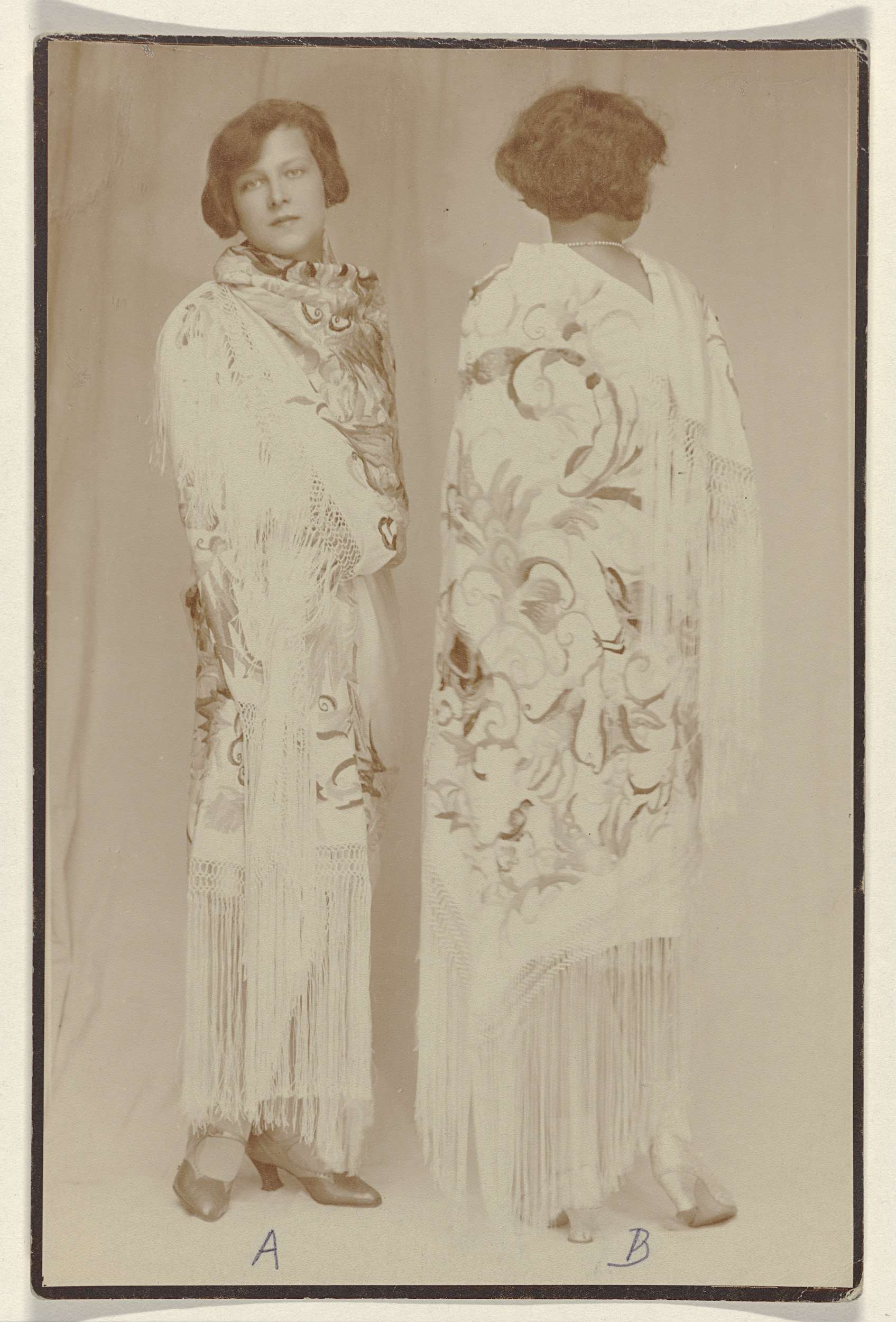 Model met geborduurde omslagdoek van de Wiener Werks...