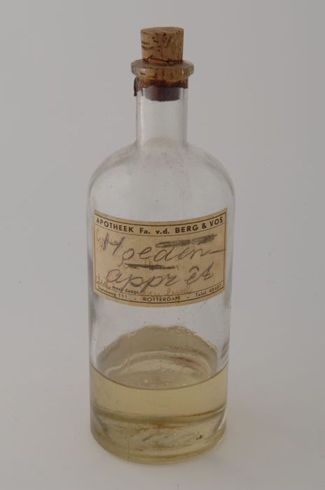 Glazen flesje met kurk, gevuld met hoedenapprêt, met...