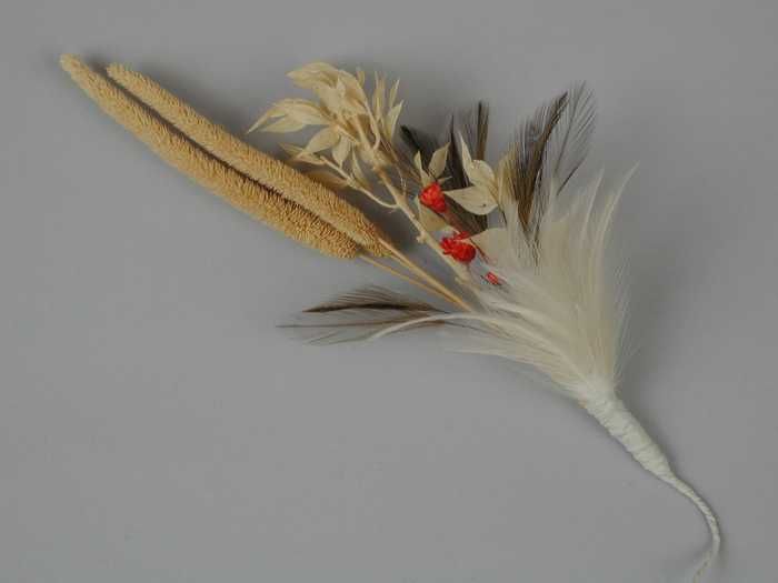 Corsage, boeketje van enkele smalle witte en bruine ...