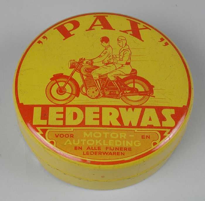 Rond blik met los deksel, "Pax, lederwas", geel en rood