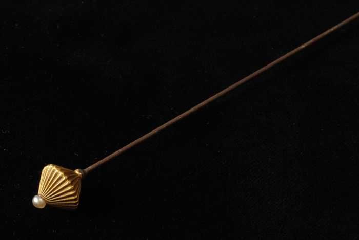 Hoedenspeld, lange metalen pin met scherpe punt, gou...