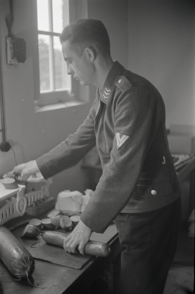 Een Luftwaffe Obergefreiter is bezig worst te snijden.