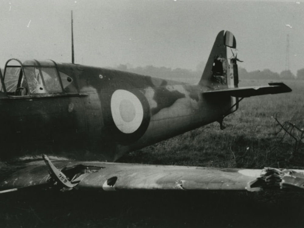 Foto wrak Bloch MB152 die een buiklanding heeft gema...