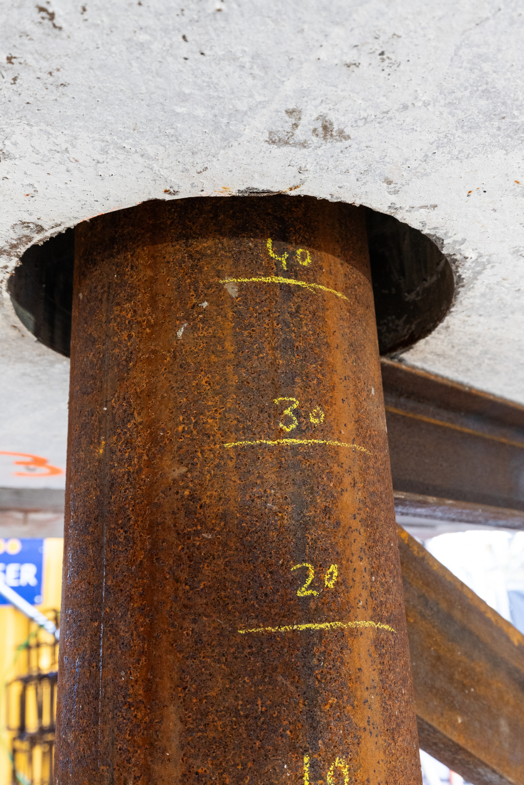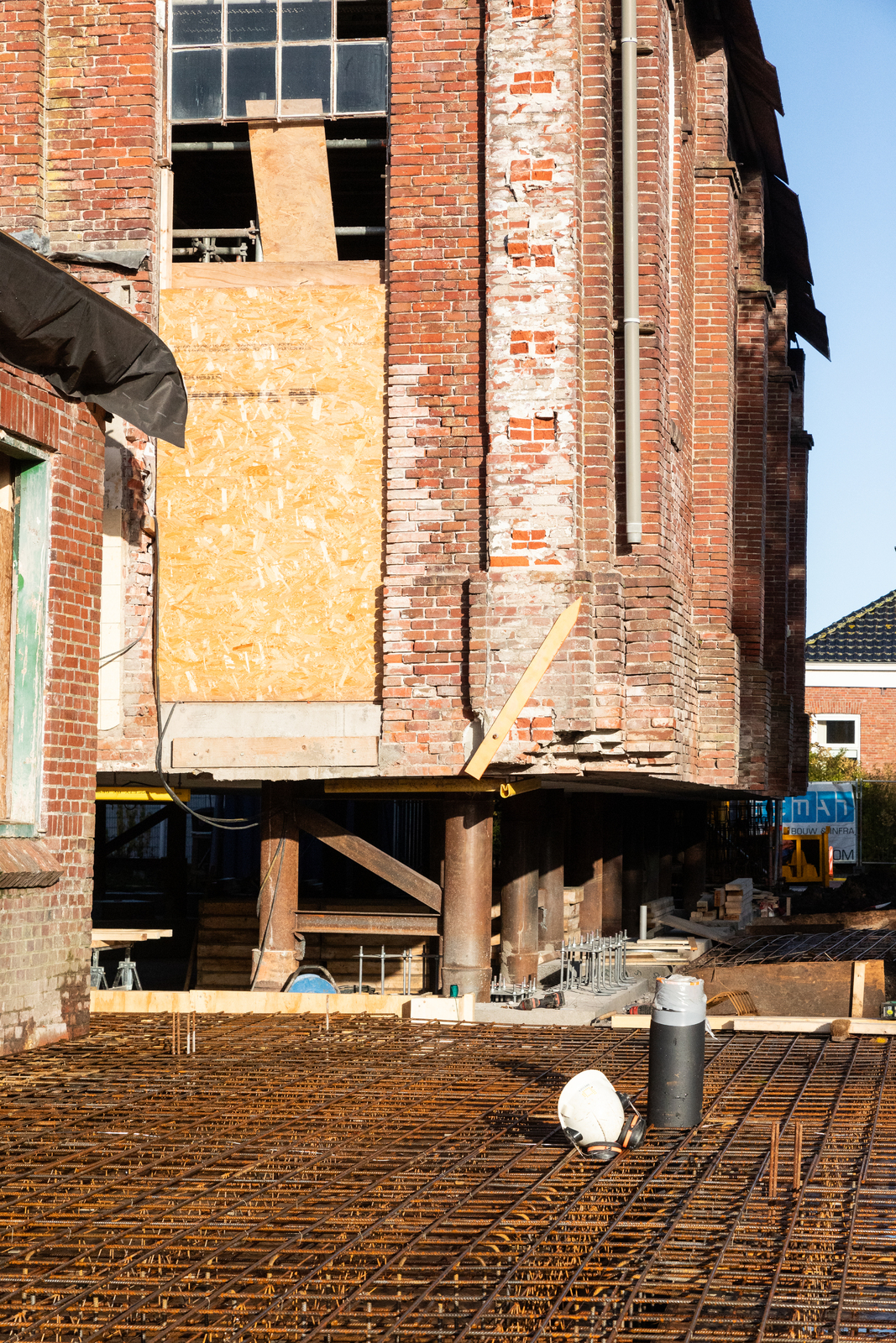 Funderingswerkzaamheden, met omhoog gevijzelde kerk