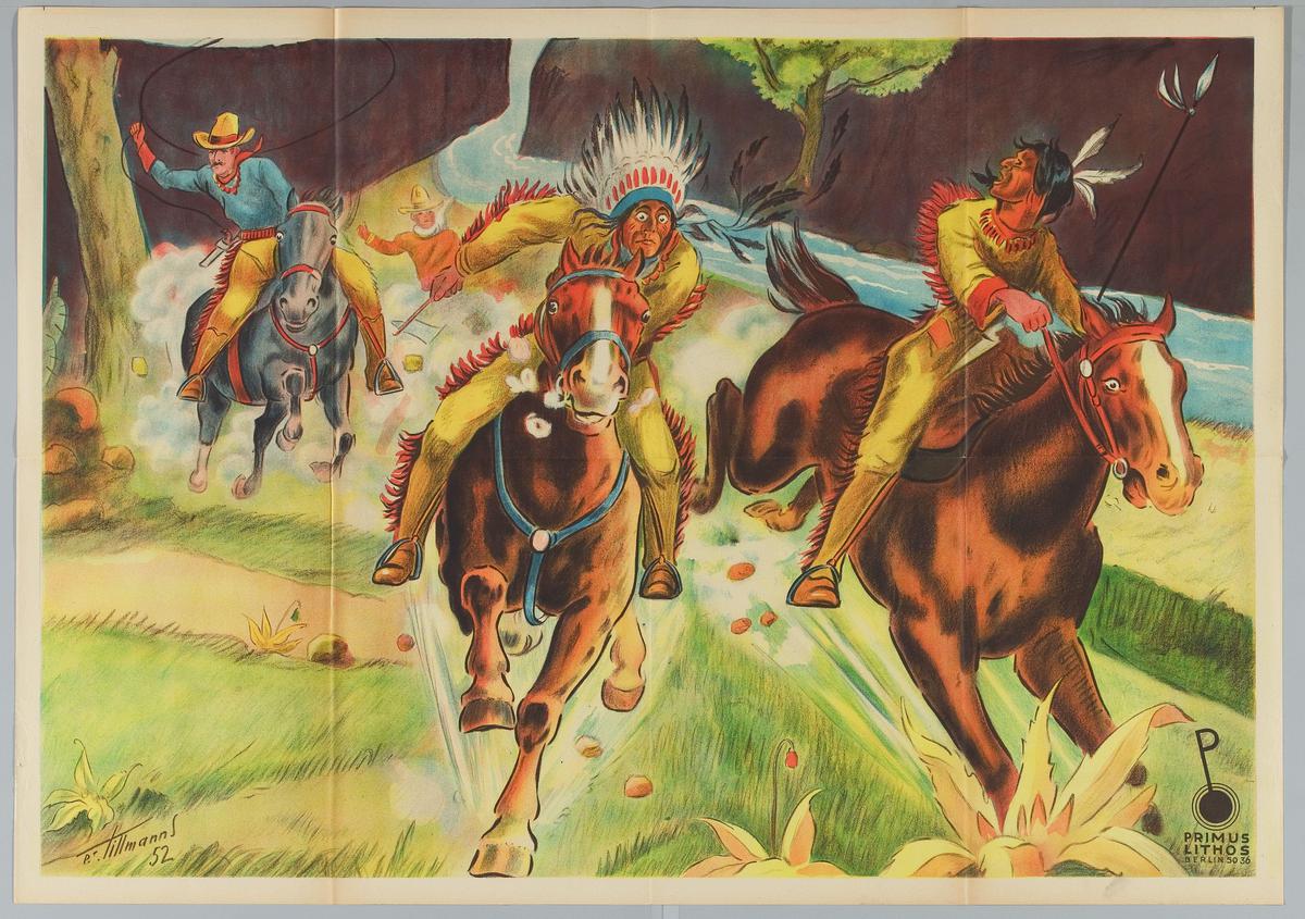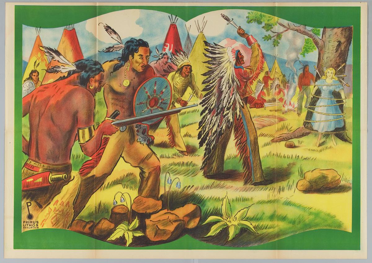 "Indianen"met een aan een boom vastgebonden vrouw