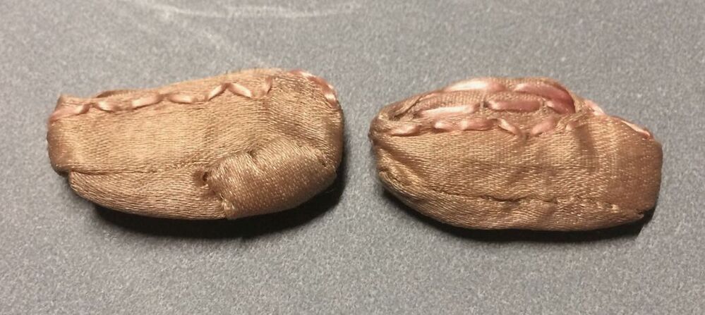 Paar slofjes van beige zijde met roze borduursel, ui...