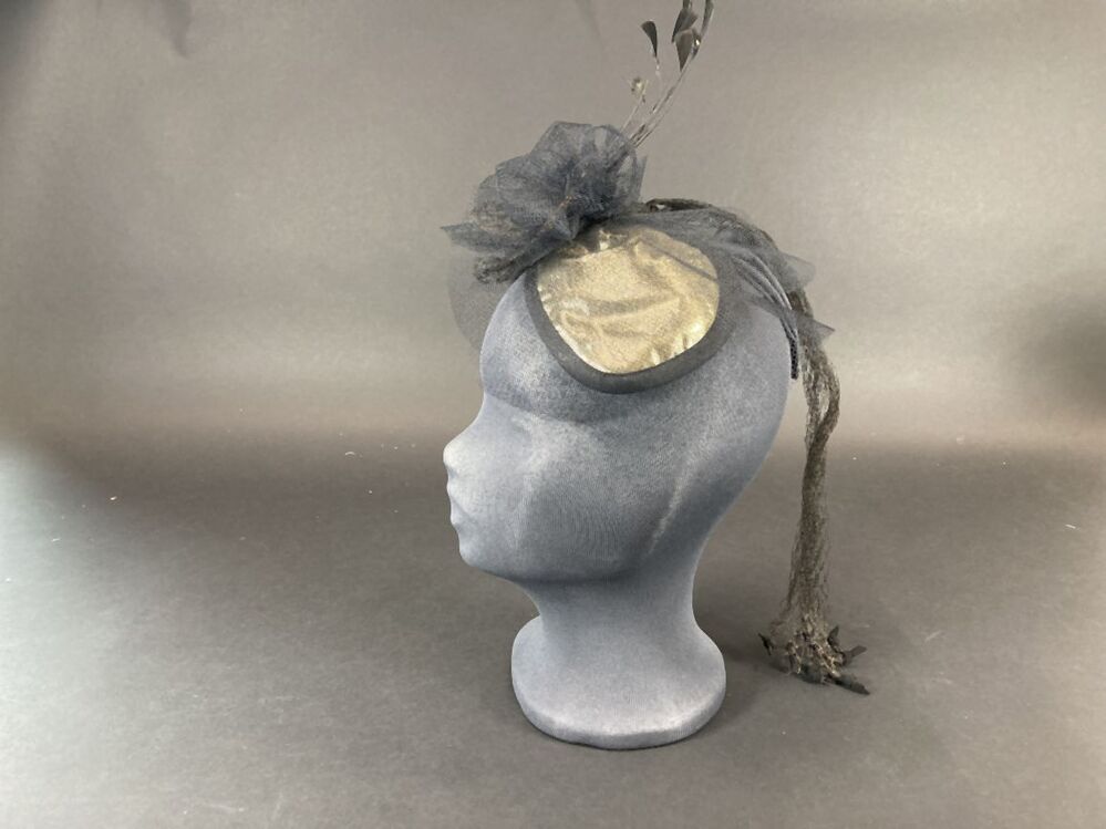 Vlindervormig hoedje van goudlamee met zwarte tule, ...