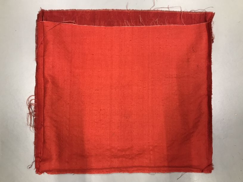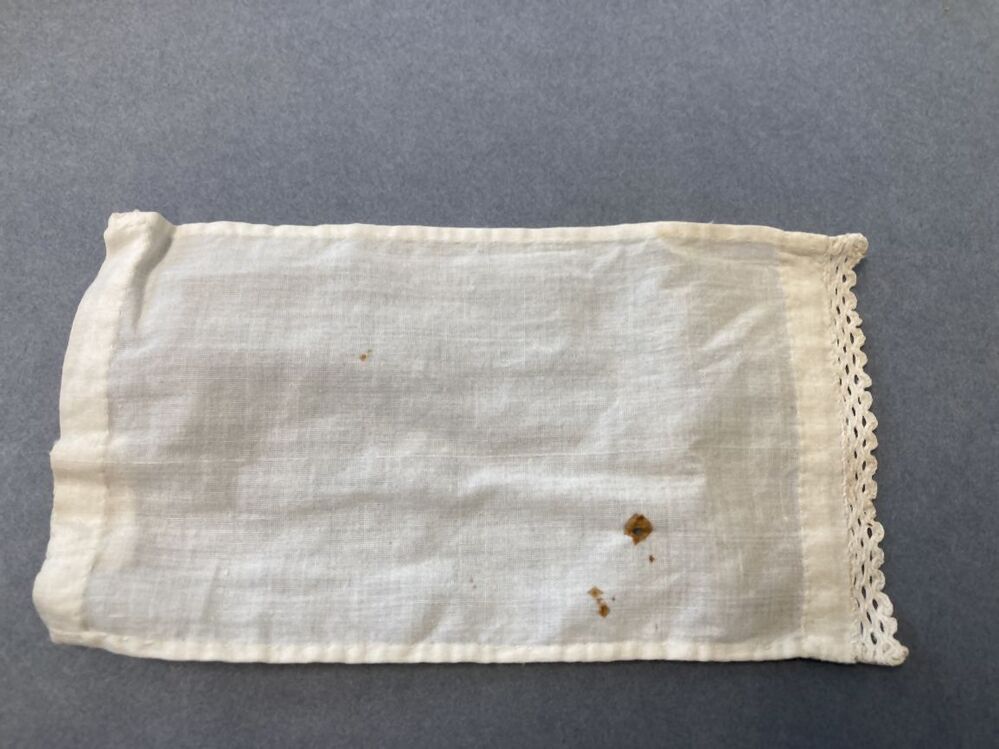 Kroplap van beige linnen met rood biesje, uit doosje...