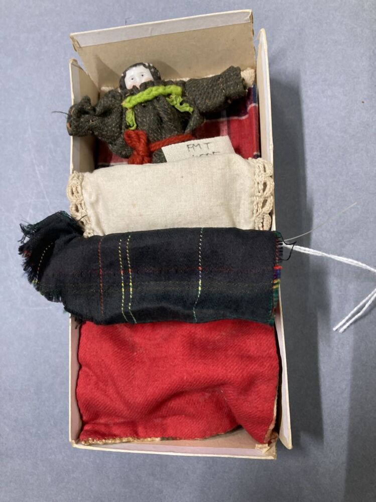 Poppenbedje gemaakt van kartonnen vanilledoos, met b...
