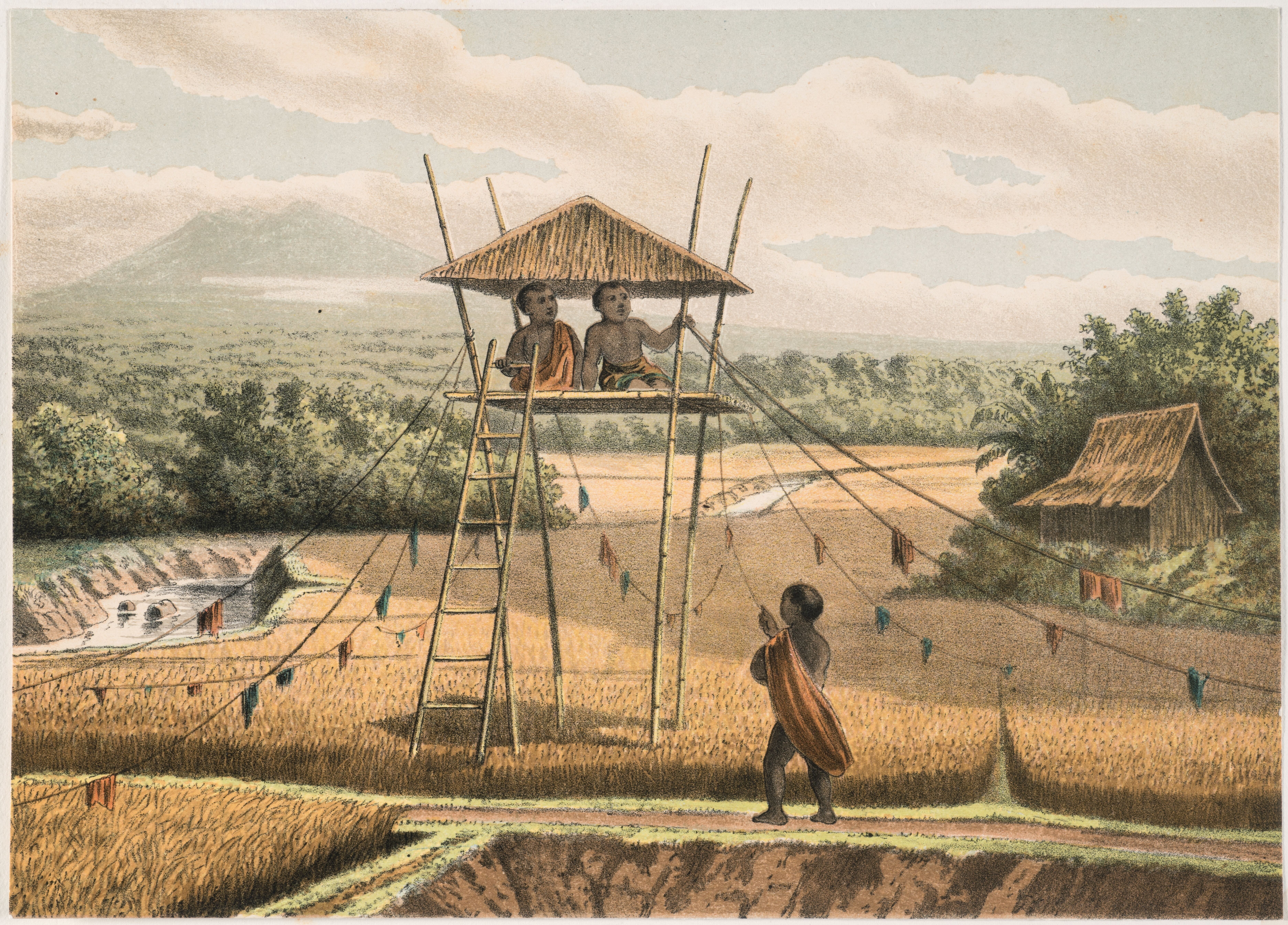 Een rijstveld op Java met een uitkijktoren