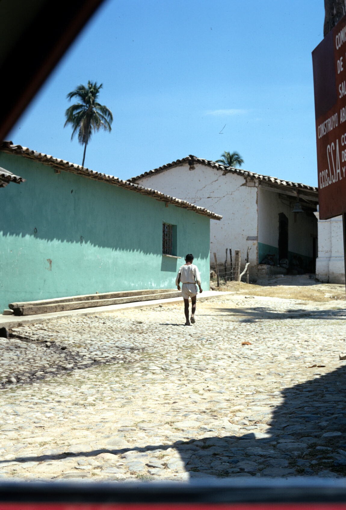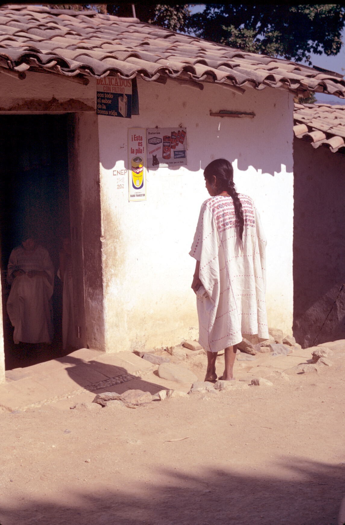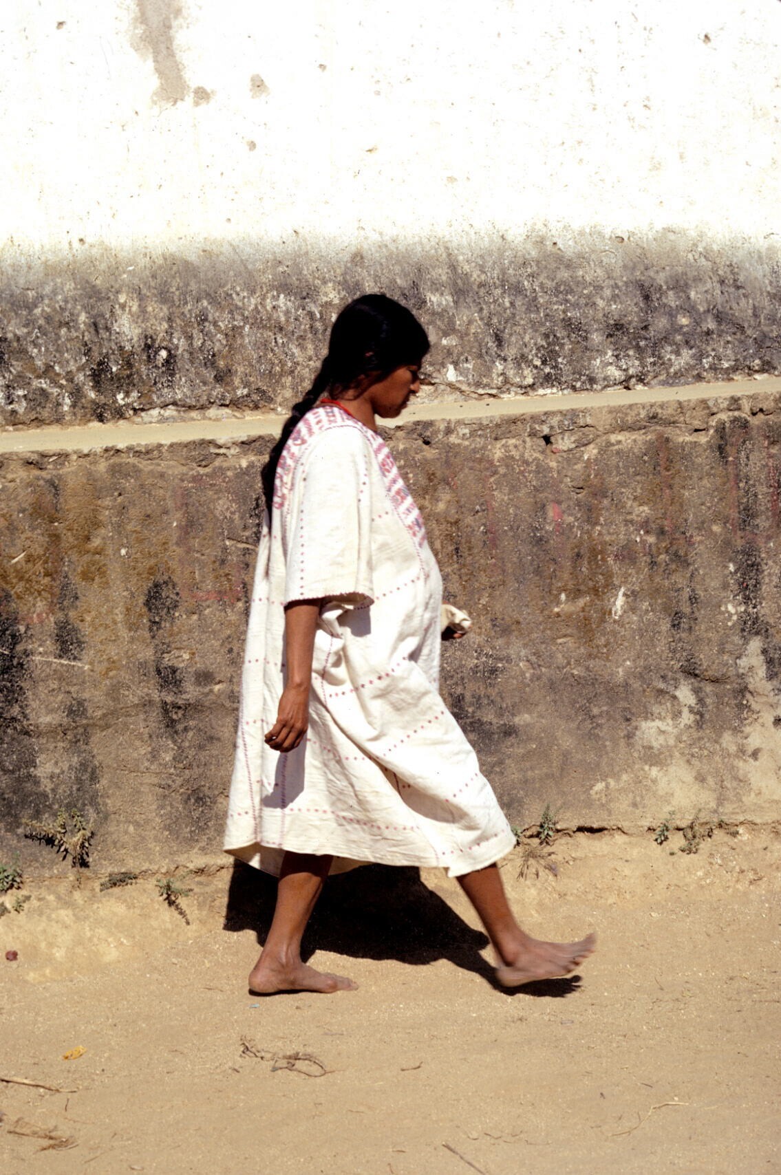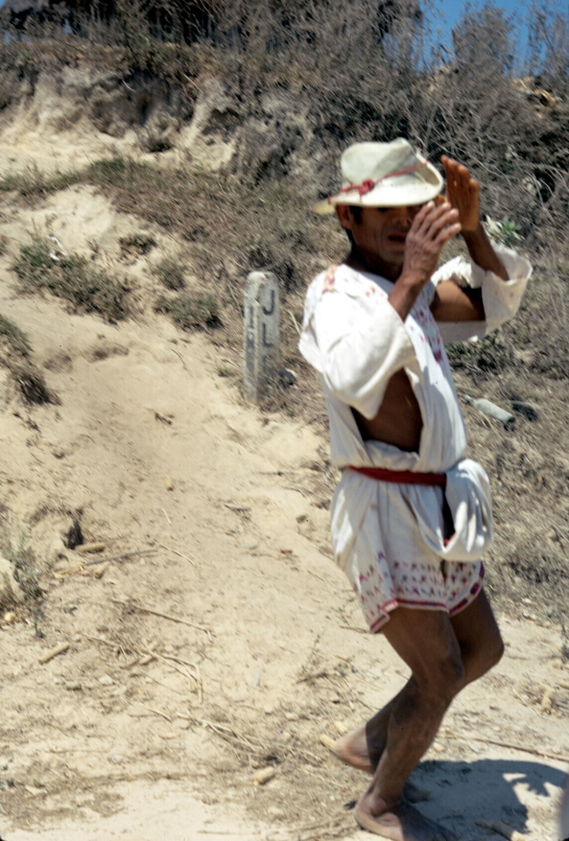 man in lokale dracht (z.g. "tacuate") in dorpsstraat