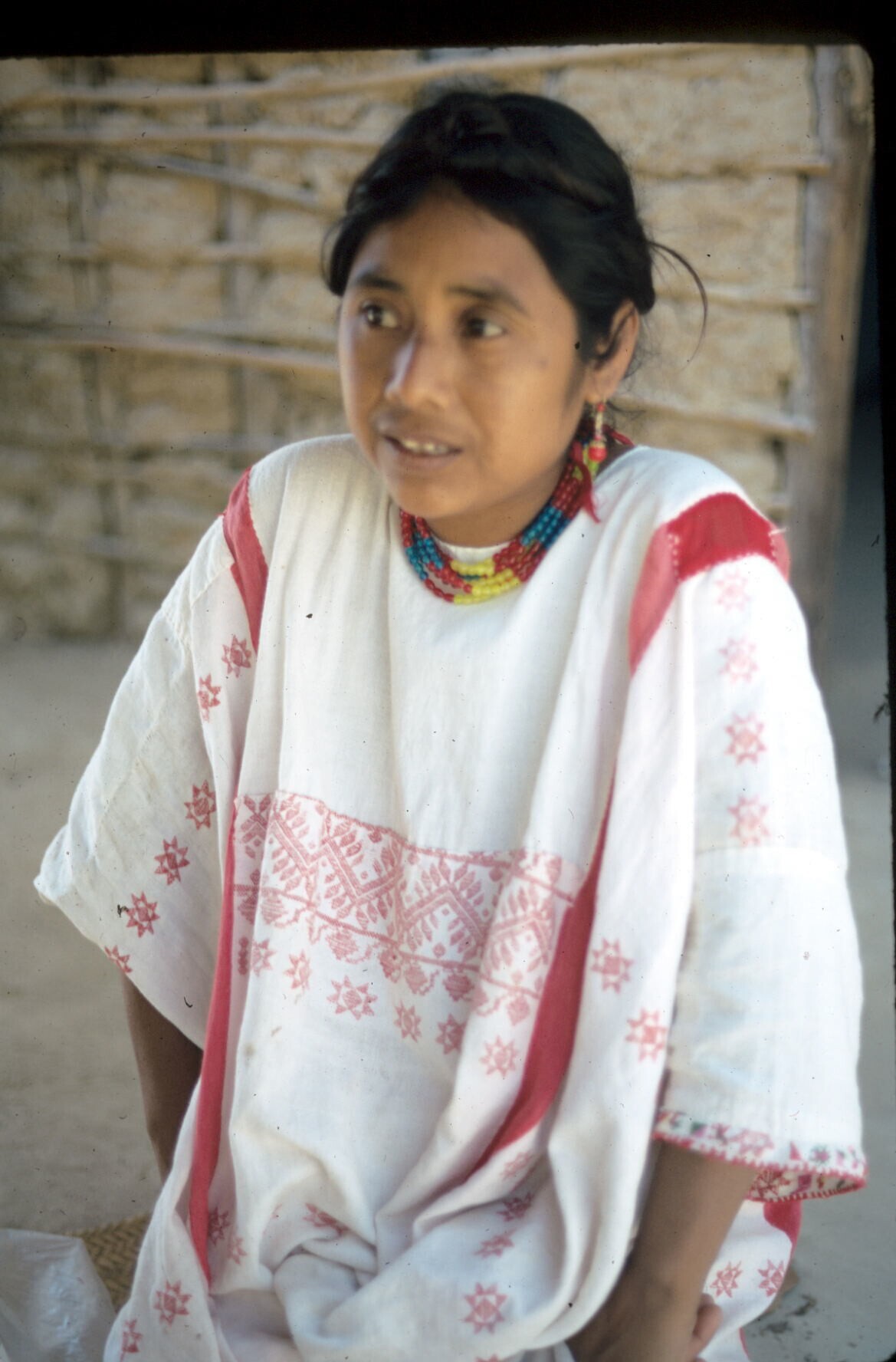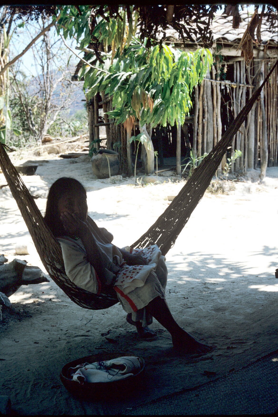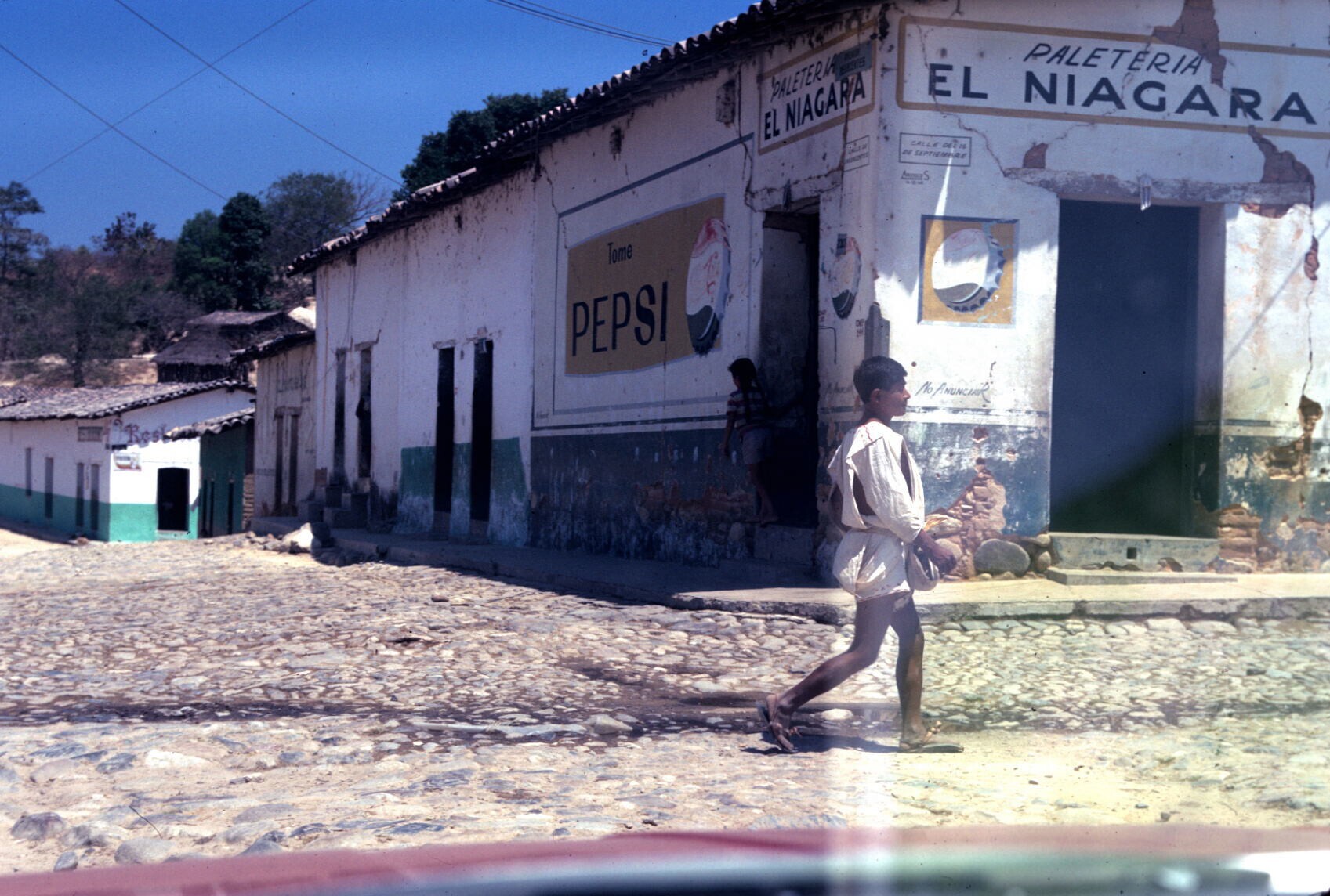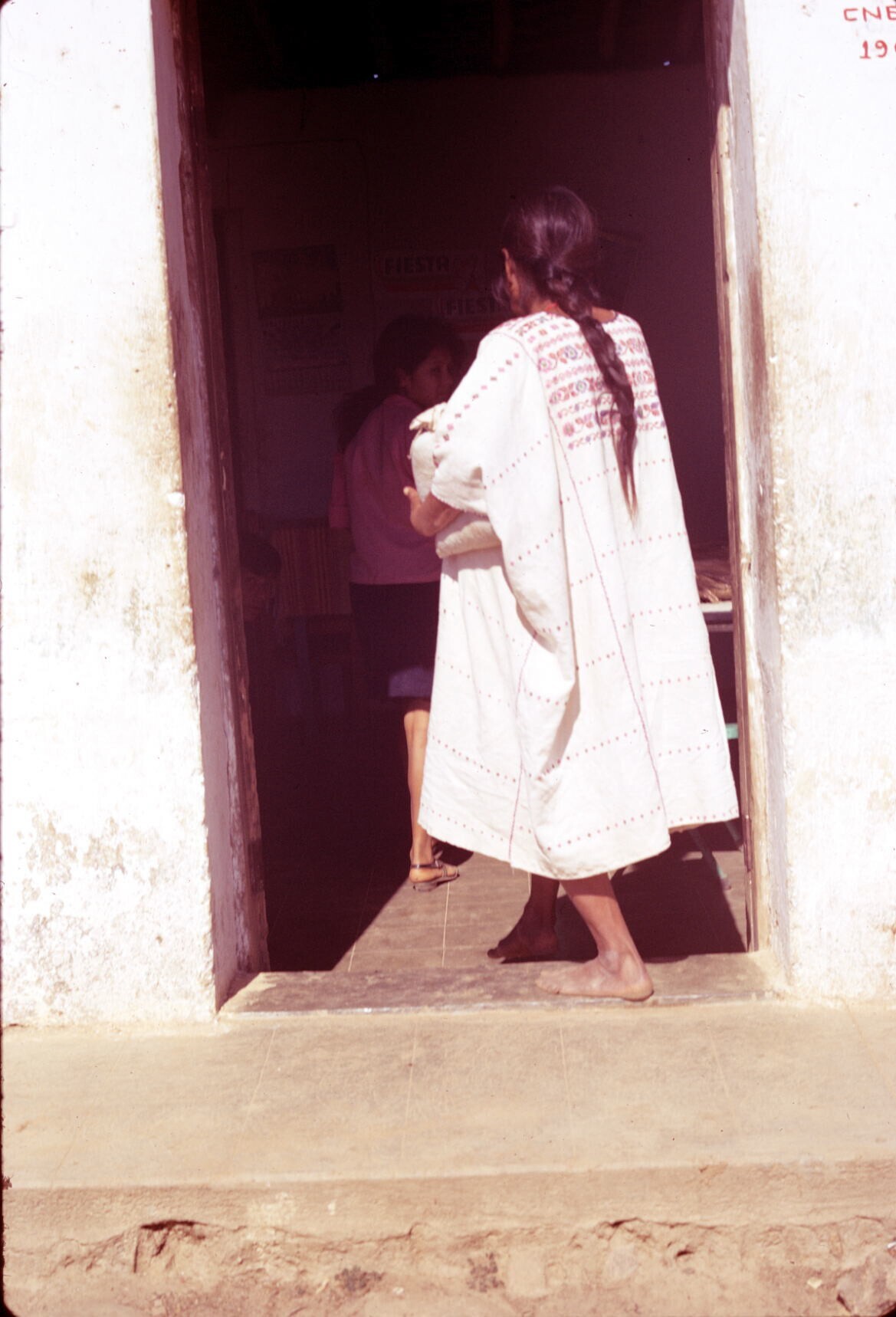 man in lokale dracht (z.g. "tacuate") in dorpsstraat