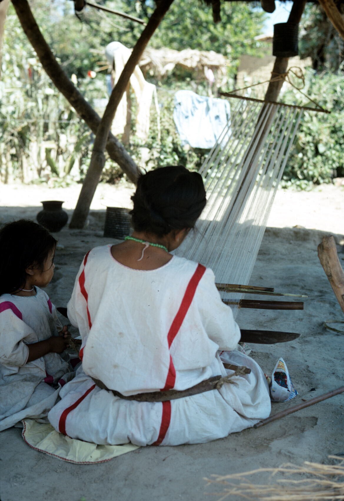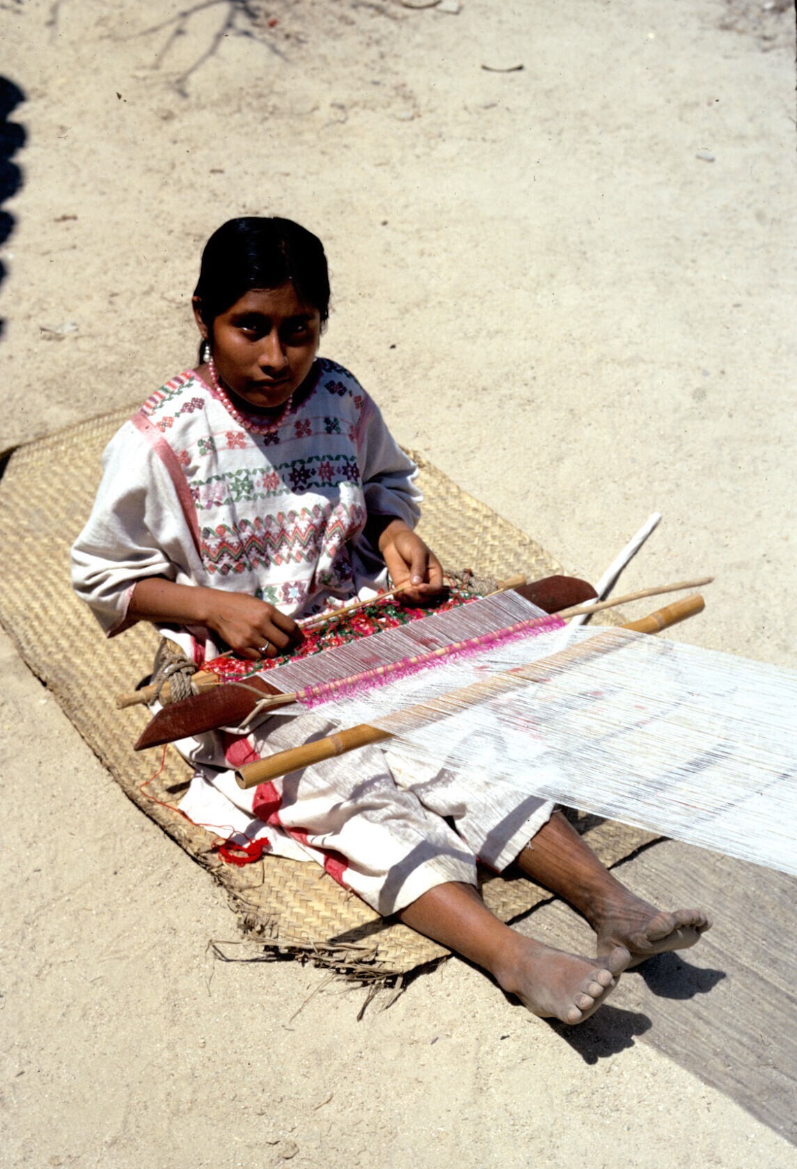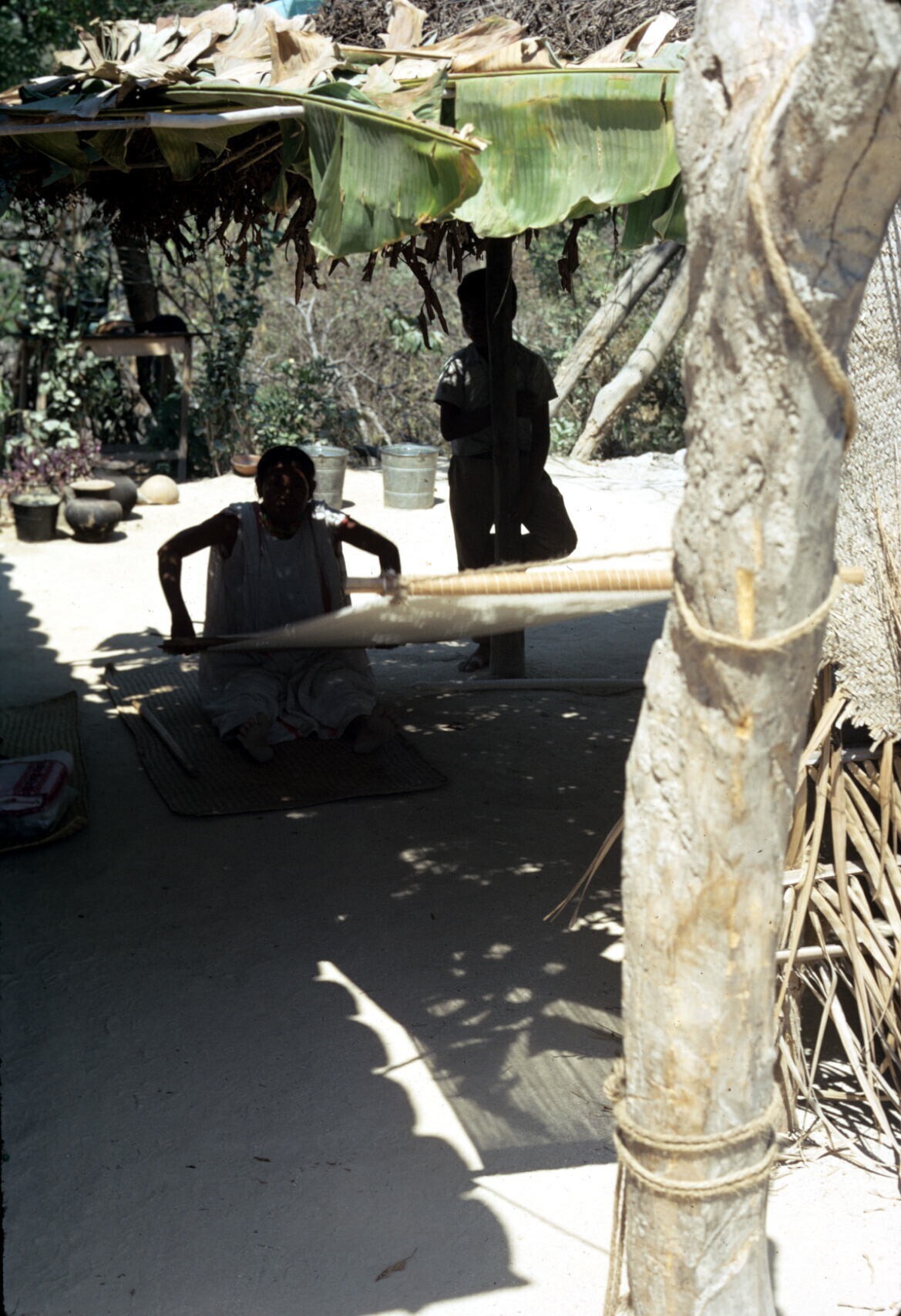 weefster Teresa Caspar, wevend op heupweefgetouw