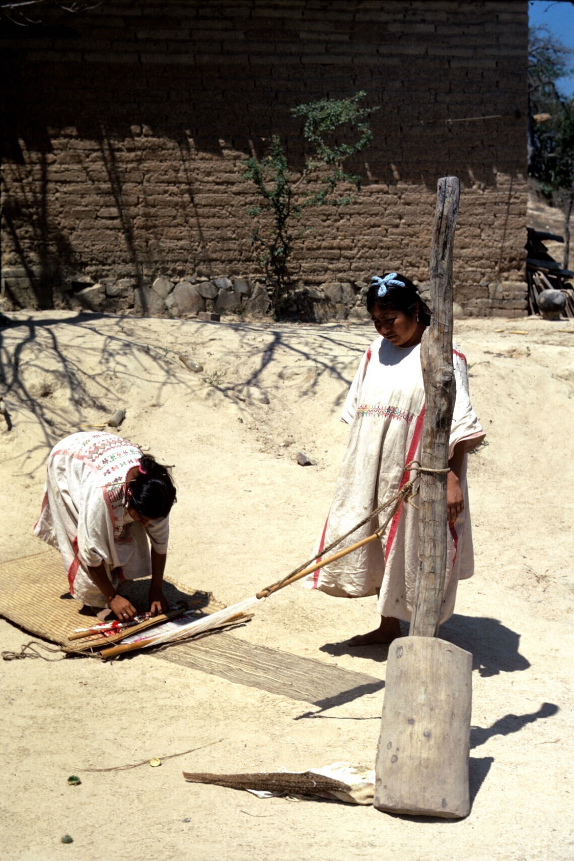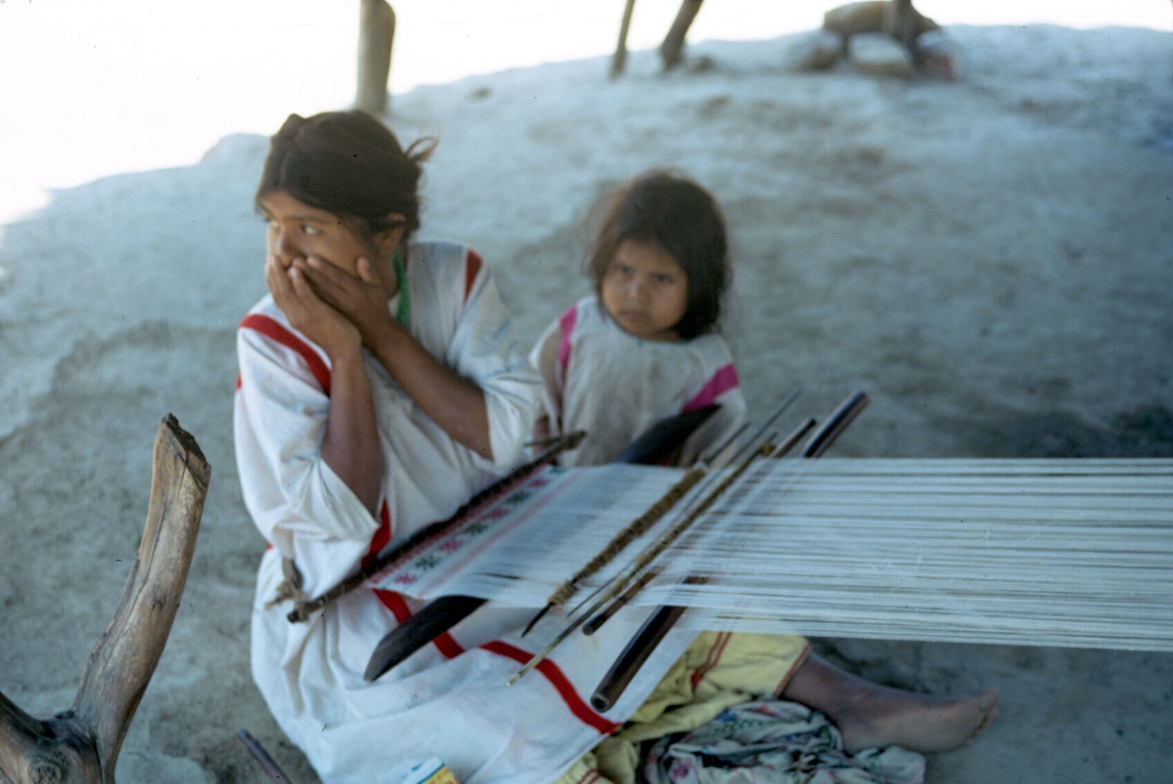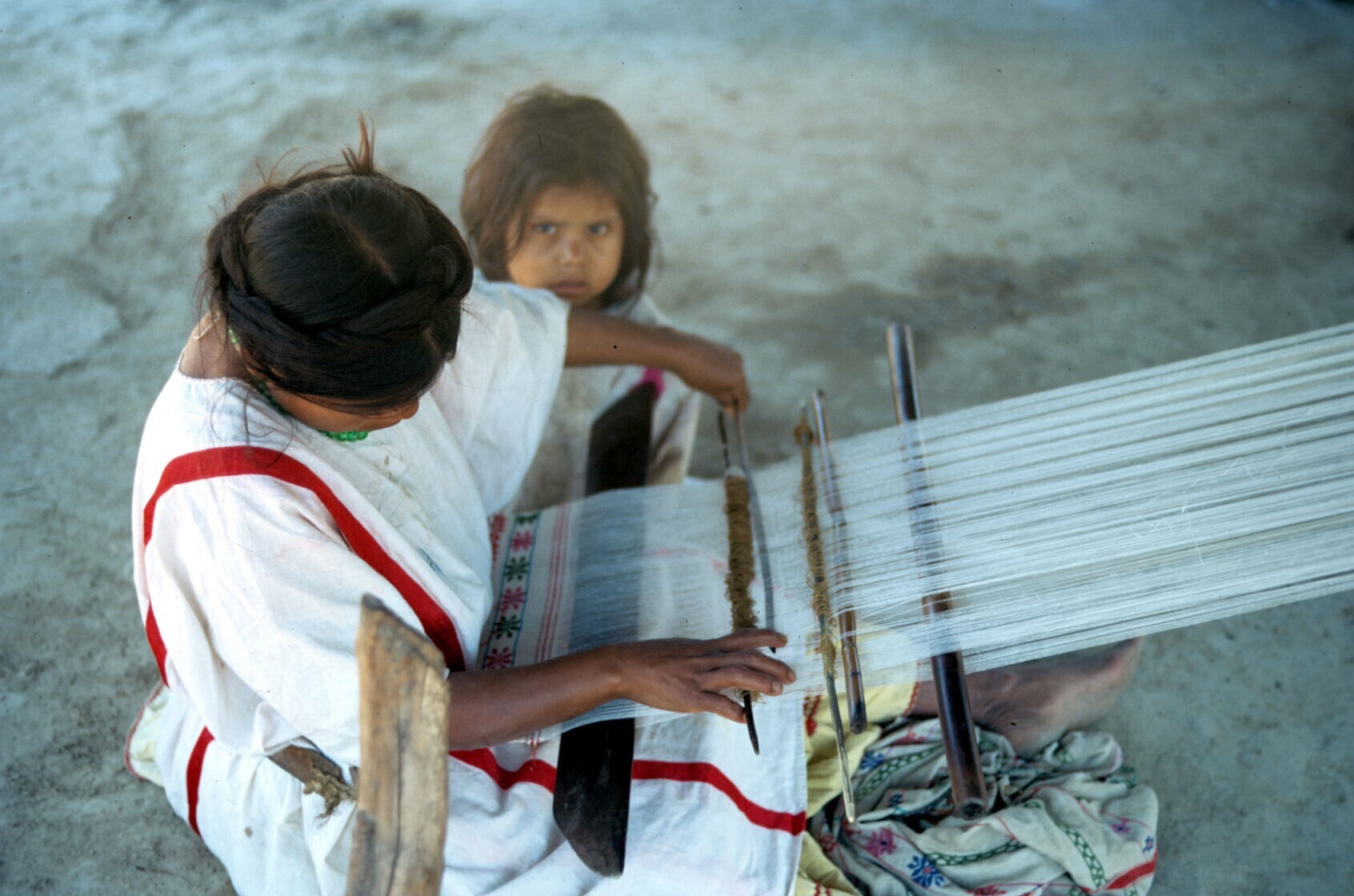weefster Teresa Caspar, wevend op heupweefgetouw