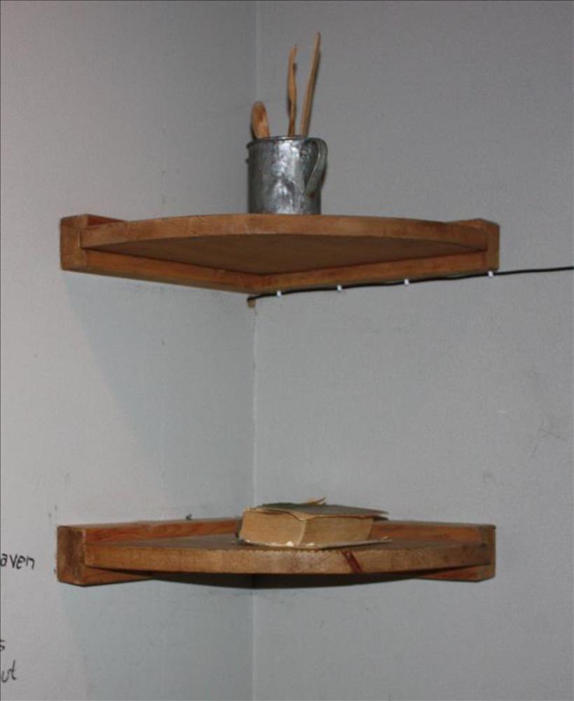 Twee houten kwartronde schappen